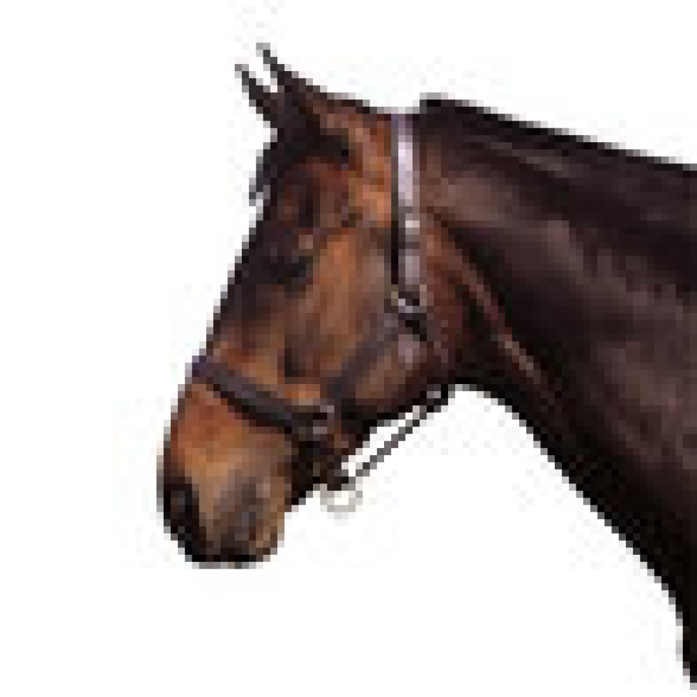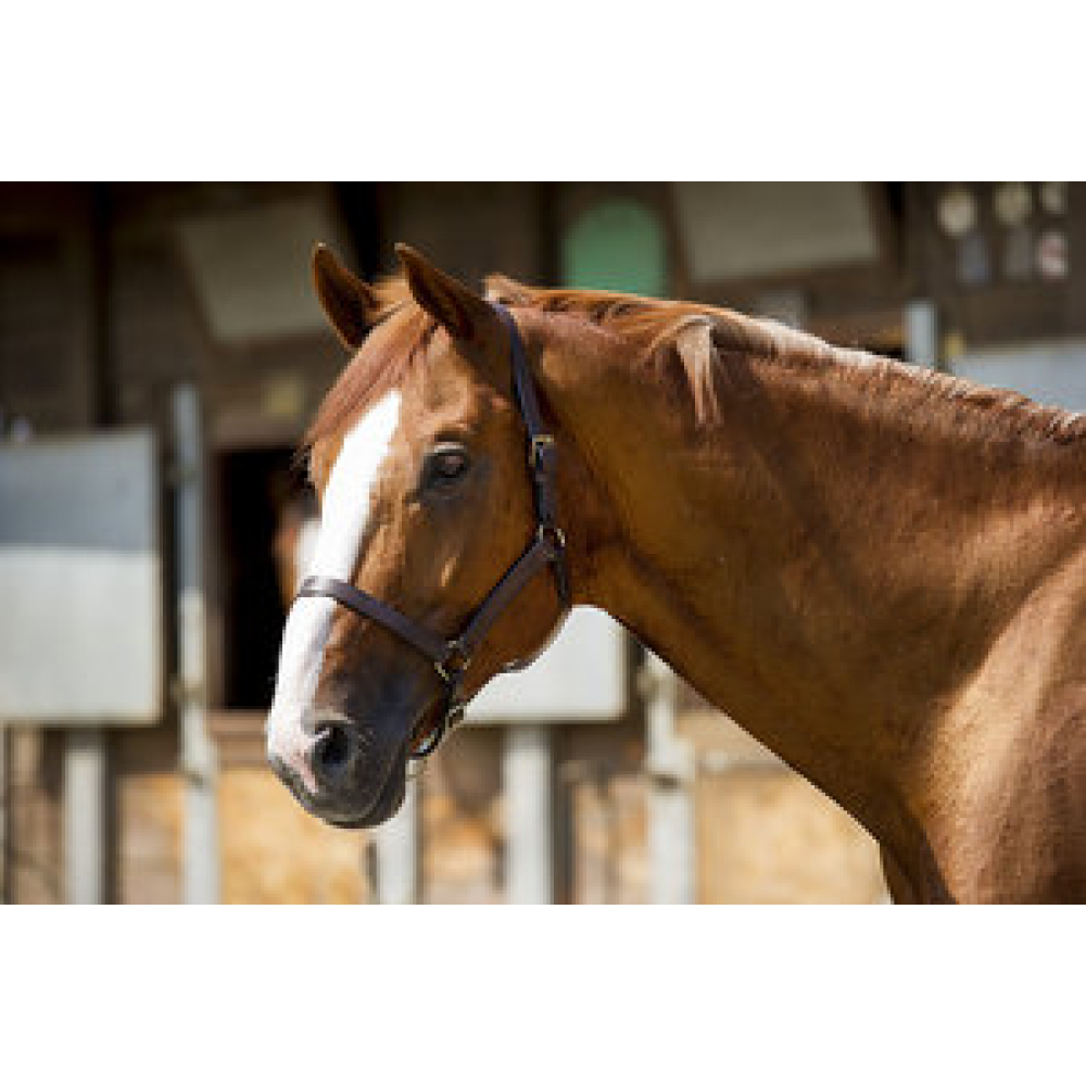 Halster van buffelleder, kopstuk en neusriem verstelbaar, geel stalen gespwerk.
