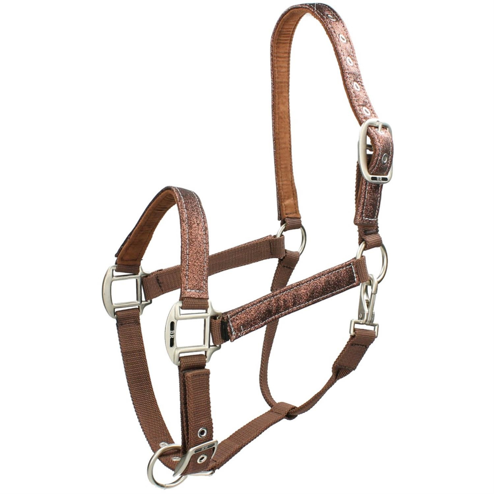 Nylon halster met zachte suegrave;dine voering onder het kopstuk en de neusriem. Neus- en halsriem zijn verstelbaar. Het kopstuk, de bakstukken en de neusriem zijn afgewerkt met glittermateriaal en contrasterend stiksel. De glitters geven het halster een exclusieve uitstraling. Het halster is voorzien van mat zilveren fournituren Verkrijgbaar in de kleuren Grijs Zwart Brons (Bruin) Caribbean Sea (Lichtblauw); Framboise (Roze); ; Let op! De grijze variant is bedekt met zilveren glitters, het nylon is echter lila.