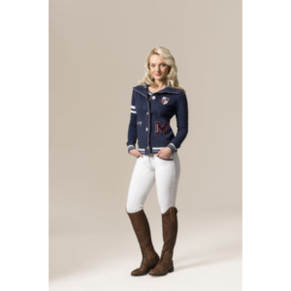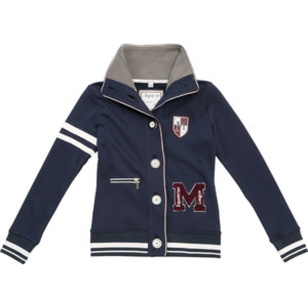 Sweatshirt van polykatoen (80% katoen en 20% polyester) met bicolour knopen. Binnenkraag en opstaande kraag afgewerkt met driekleurig koord. Onderkant, manchetten en binnenkraag gebreid. 2 kenmerkende witte strepen in chevron geweven katoen op de rechtermouw voor een “varsity” spirit en decoratieve gestreepte band aan de onderkant van de linkermouw . Badge en her-borduurde badge op de linker borst en decoratieve rits met bies aan de rechterkant. Opliggende print op de achterkant van de kraag en een klinknagel op een korrelige badge op de rug. Machine wasbaar op 30°C.