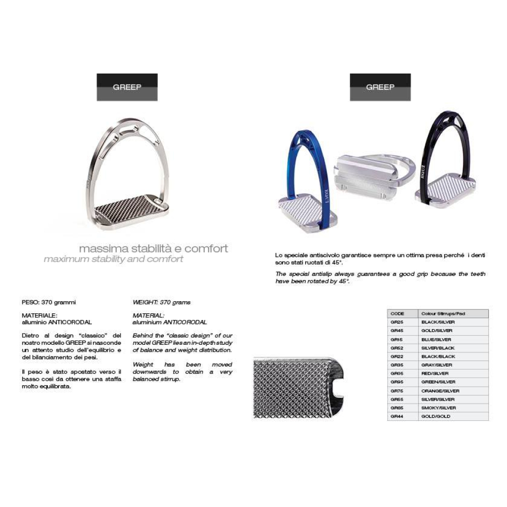 Maximale stabiliteit en comfort: Achter het klassiekedesign van deze stijgbeugel zit een diepte studie over balans en gewichtsdistributie. Het gewicht van deze lichte beugel is naar beneden verplaatst voor een optimale balans van de beugel Het speciale antgripsysteem garandeerd goede grip doordat de tanden 45deg; zijn gedraaid. Materiaal: Anticorodal Alluminium Gewicht: 370 gram Deze beugels zijn in vele kleuren verkrijgbaar. Zit de door u gewenste kleur er niet bij? Neem dan contact op met de winkel, wellicht kunnen wij de door u gewenste kleur voor u bestellen in Italië.
