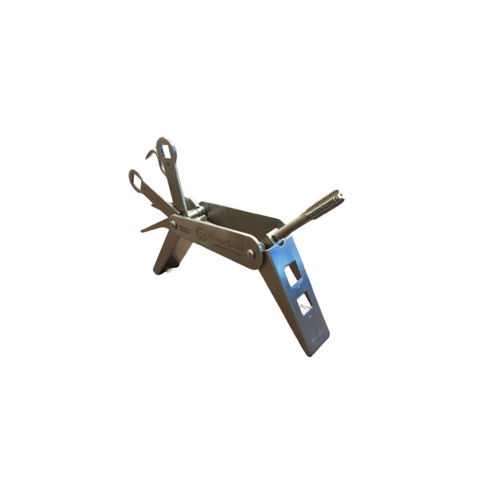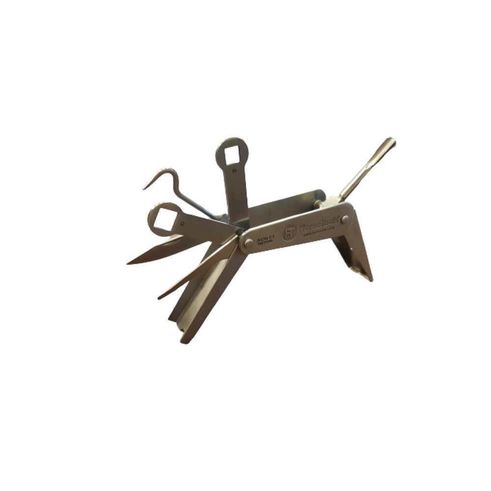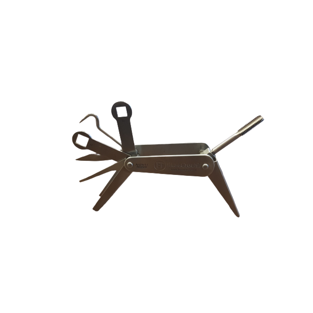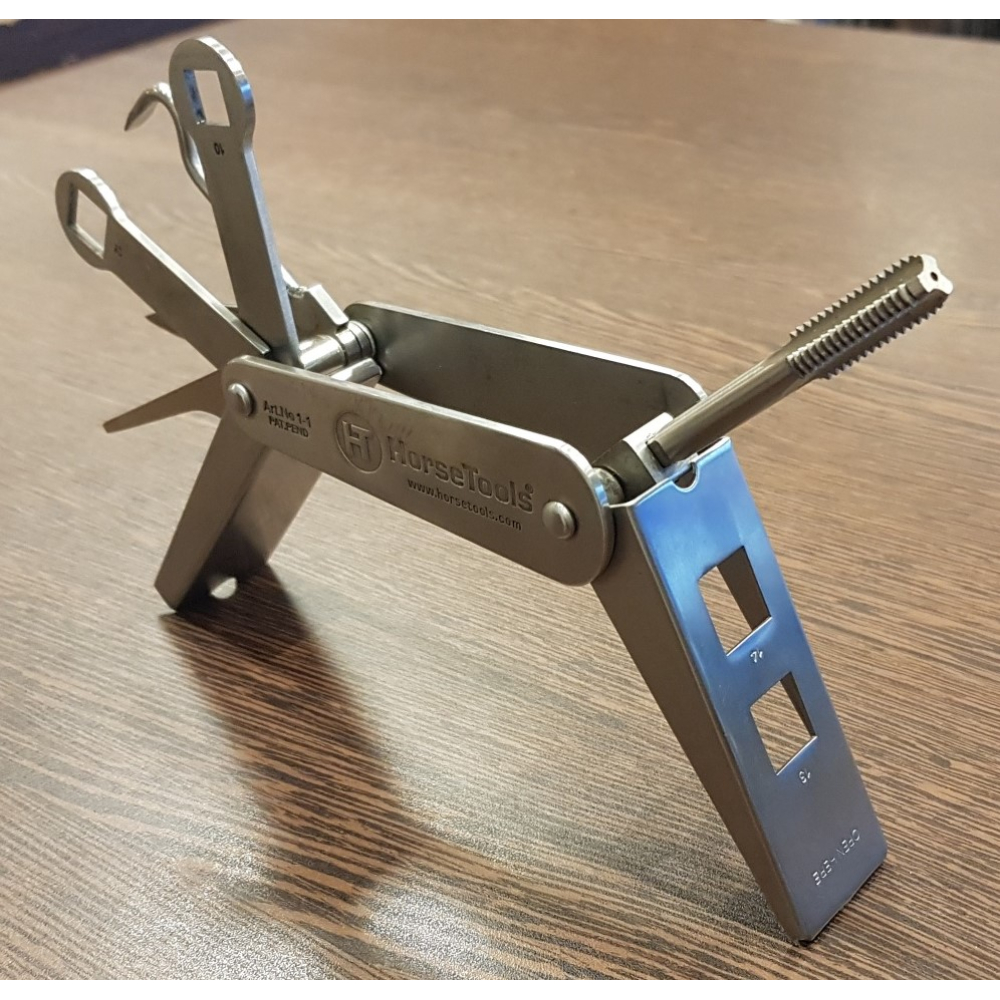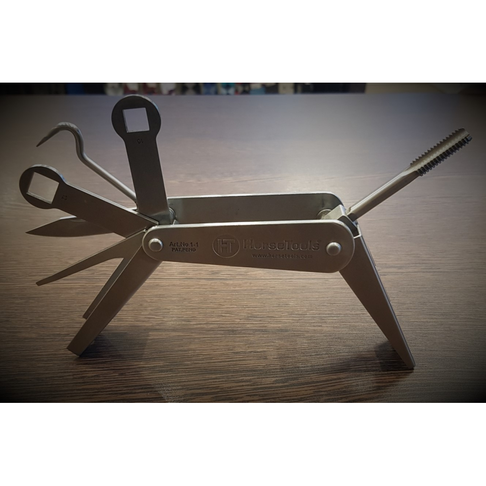 Met het multi-gereedschap van HorseTools heeft u alles bij de hand voor de verzorging en het schoonmaken van hoeven, hoefijzers en kalkoenen. De set bevat: een hoevenkrabber, reiniger, draadtap, kalkoensleutels in 4 verschillende maten en een zakmes. De delen werken als een slot waarmee het geselecteerde gereedschap stevig op zijn plaats wordt gehouden en dat tevens als een handvat dient terwijl u ermee werkt. Het multi-gereedschap wordt geleverd in een degelijke nylon hoes met klittenband sluiting. De hoes heeft ook een lus om de set overal op te kunnen hangen waar u hem maar nodig heeft, bijvoorbeeld in de stallen. Het multi-gereedschap is gemaakt van een hoogwaardige kwaliteit roestvrij staal. W3/8 tap