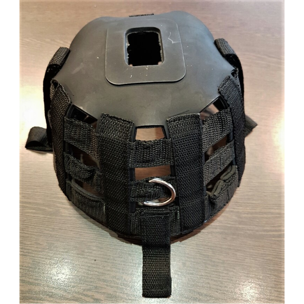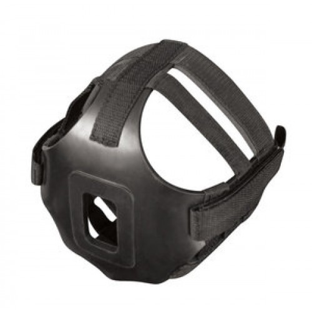 Maulkorb aus Gummi mit einer perforierten Basis und Verstärkungsrippen aus Polypropylen. Rutschfeste „Soft“ Innenkante. Wird am Halfter mit dreifachem Klettbandverschluss angebracht. Befestigungsring für Führstrick.