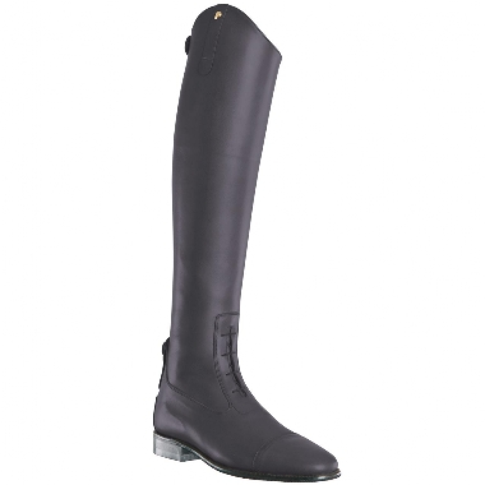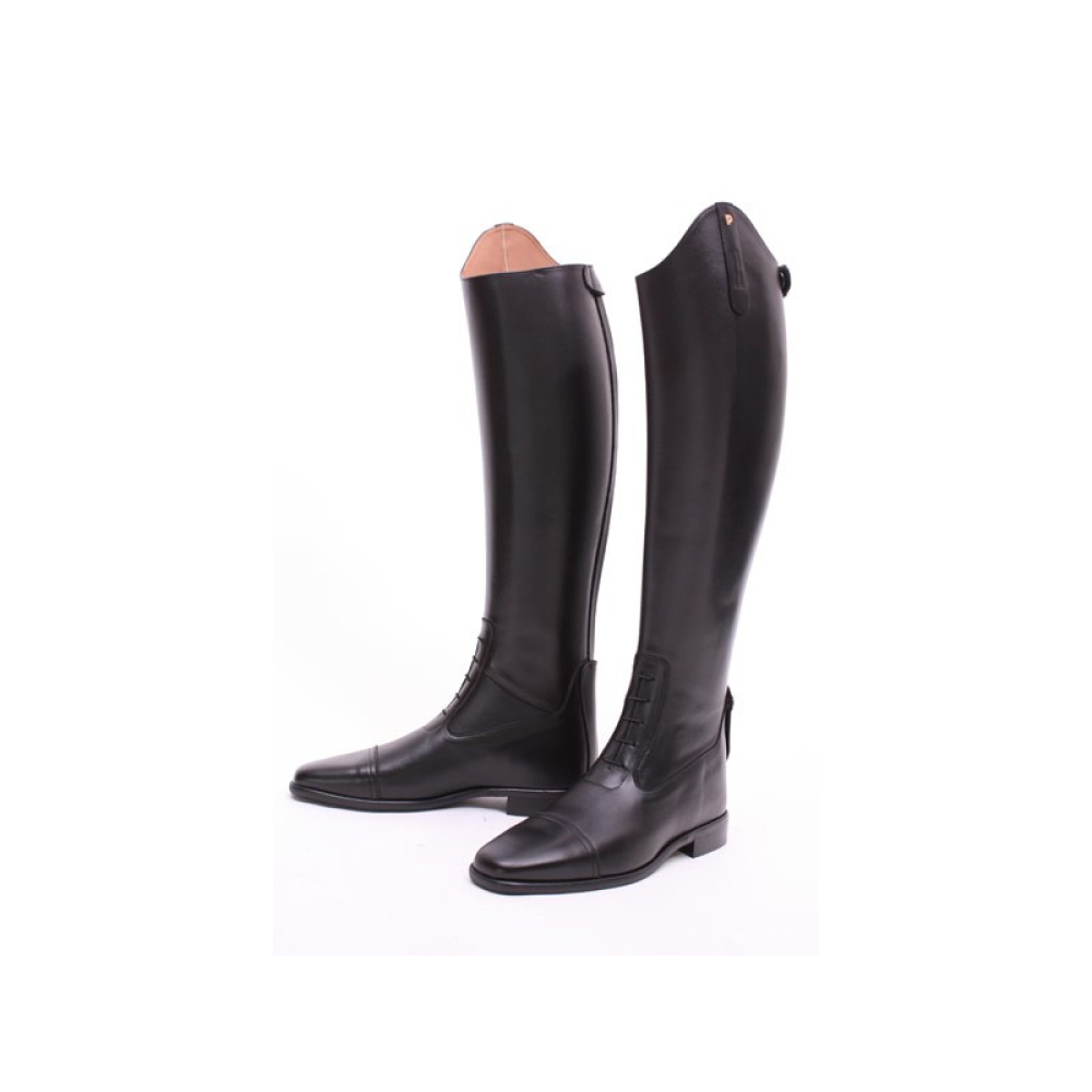 De Coventry van Petrie is een elegante slanke rijlaars welke in het geheel nauw aansluit, ook bij de enkel. Deze rijlaars heeft een elastische vetersluiting op de wreef. De Coventry is een soft rundlederen rijlaars en heeft een ritsluiting aan de achterzijde van de schacht, welke reikt tot aan de AGO-gelijmde rubberen zool. De rits is aan de bovenkant en onderkant afgewerkt met een beschermende drukknoop sluiting. De kap van de laars heeft een boog van 5cm. De laars is met leder gevoerd en heeft een extra comfort voetbed. De Coventry is leverbaar in zwart, bruin en cognac. Ook zijn deze rijlaarzen leverbaar in overige maten. Deze rijlaars heeft de volgende maten: <ul> <li>* Voet = 5</li> <li>* Kuit = 35</li> <li>8 Hoogte = 47</li> </ul> Neem contact met ons op voor andere maten en kleuren of om op maar gemaakte laarzen te bestellen.
