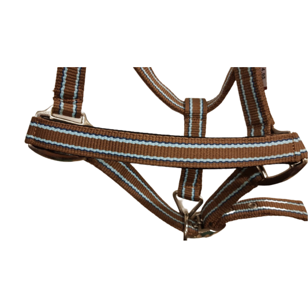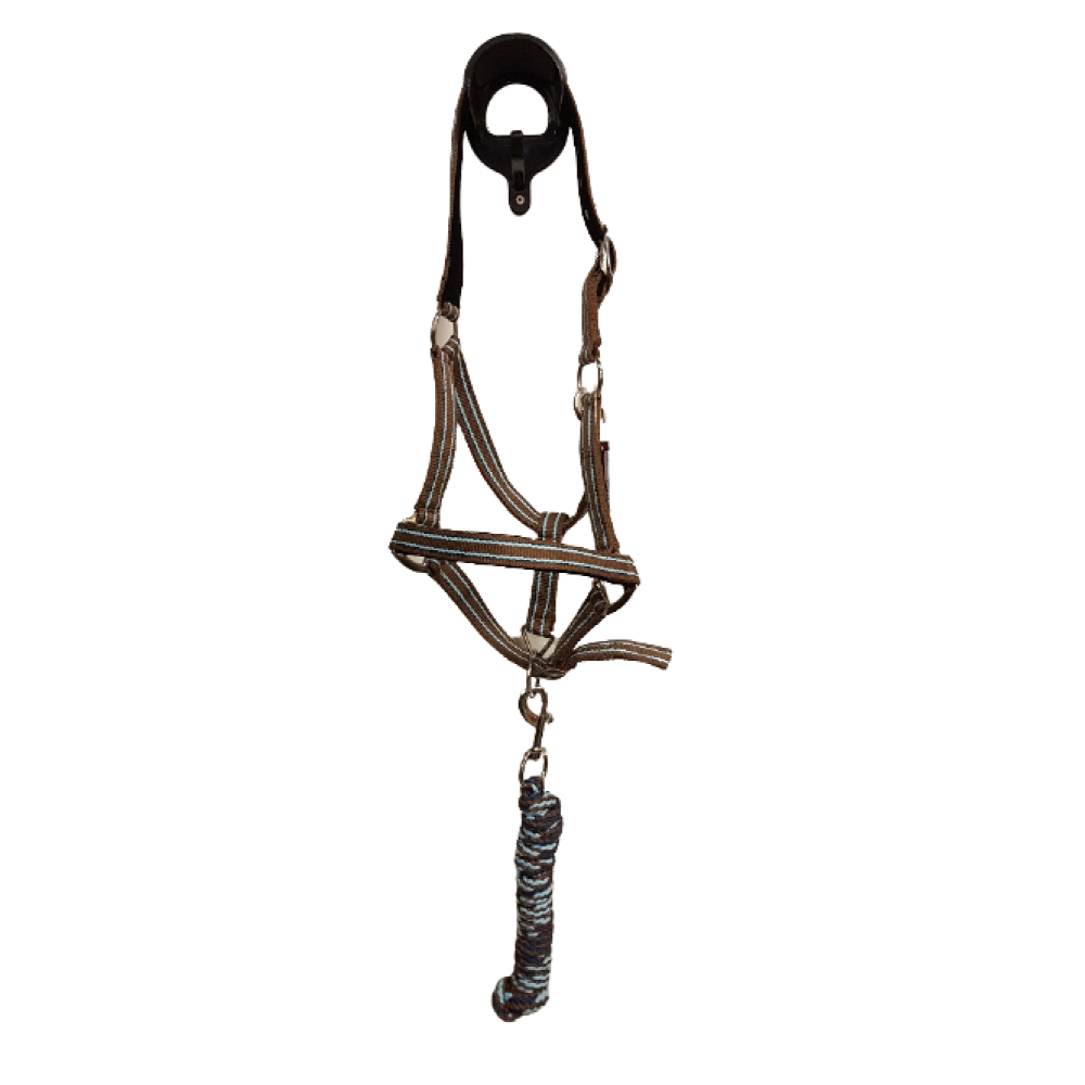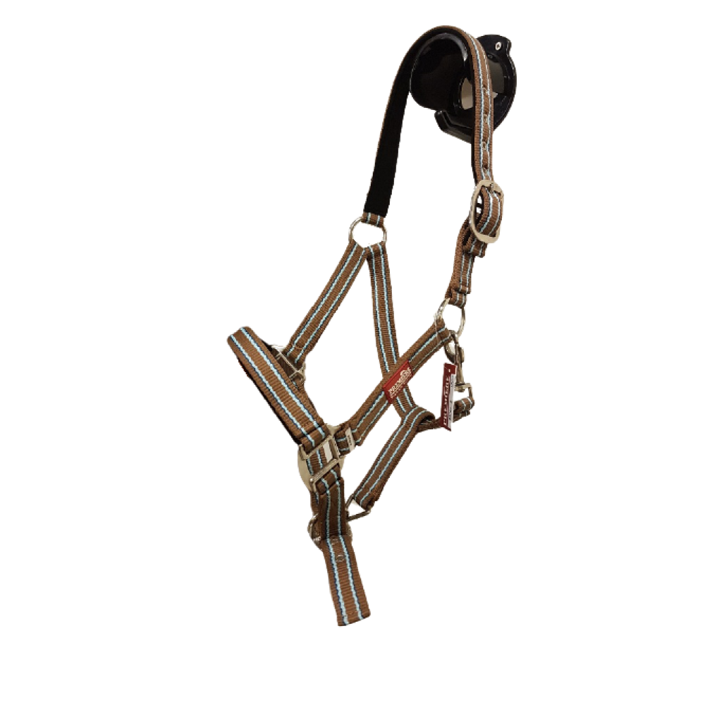 Premiere halsterset A Materiaal: 100% polyester garen, kopstuk en neusriem zijn gevoerd met soft nubuck Hardware: zink met chroom finish ; Driekleurig halster ; Kopstuk en neusriem zijn verstelbaar