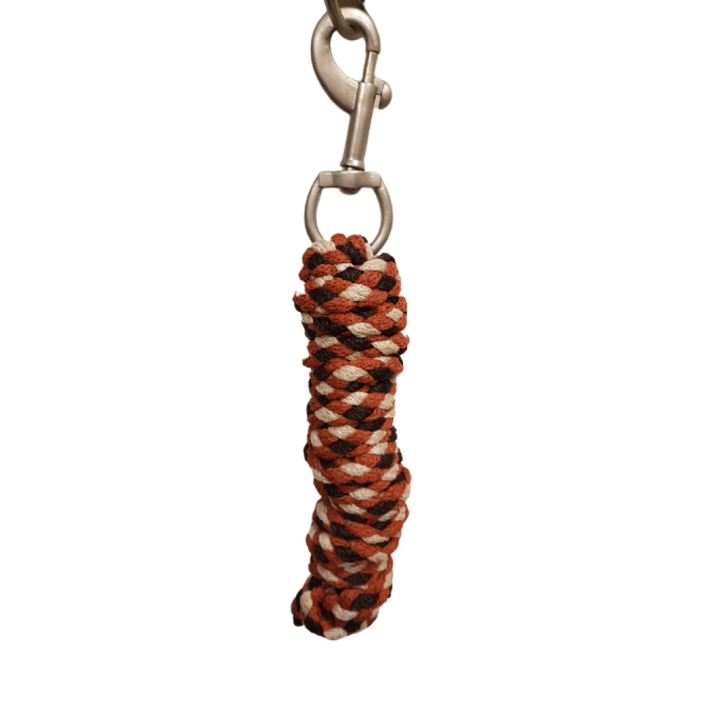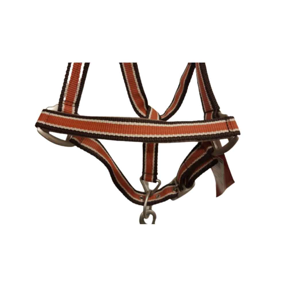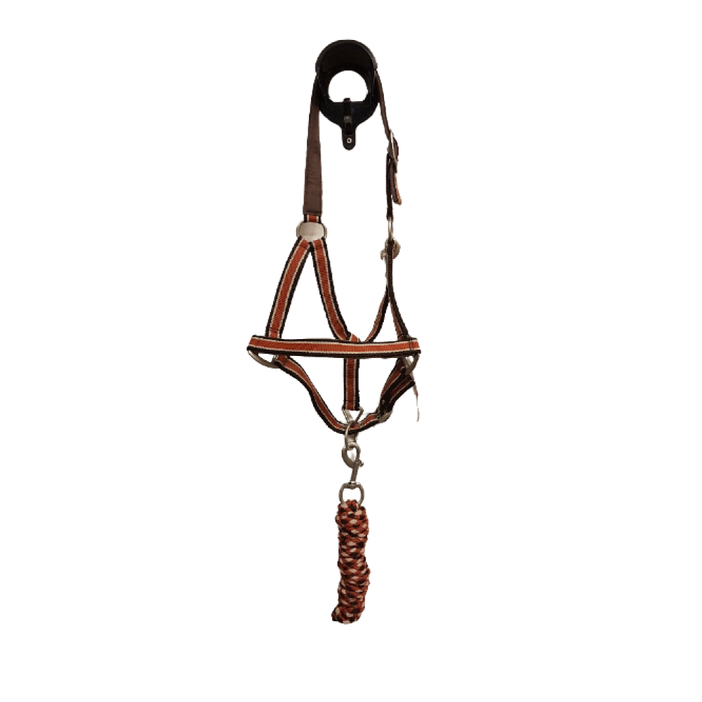 Driekleurig gestreepte halsterset, bestaande uit een polyester halster en een polyester lijn met musketon. Het halster is ruim verstelbaar aan de neusriem en het kopstuk. De neusriem en het kopstuk zijn zacht gevoerd met een gekleurde, synthetische bontvoering
