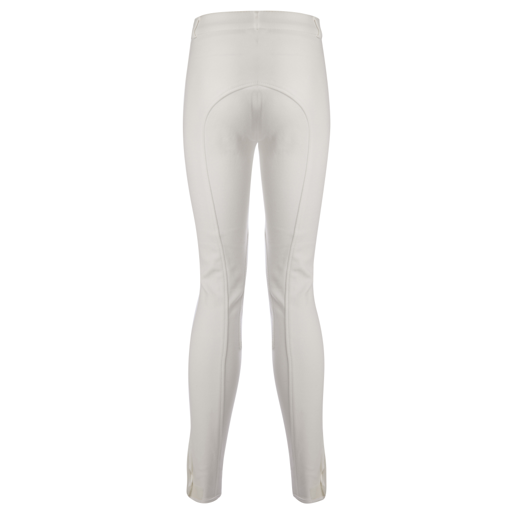 Strak model kinderrijbroek met aan de voorkant een ritszakje. De broek is voorzien van stoffen kniestukken (SKP), een rondgenaaid zitvlak en een klittenbandsluiting aan het uiteinde van de broekspijp. Vervaardigd van 95% katoen/ 5% elasthaan, gebreide kwaliteit.