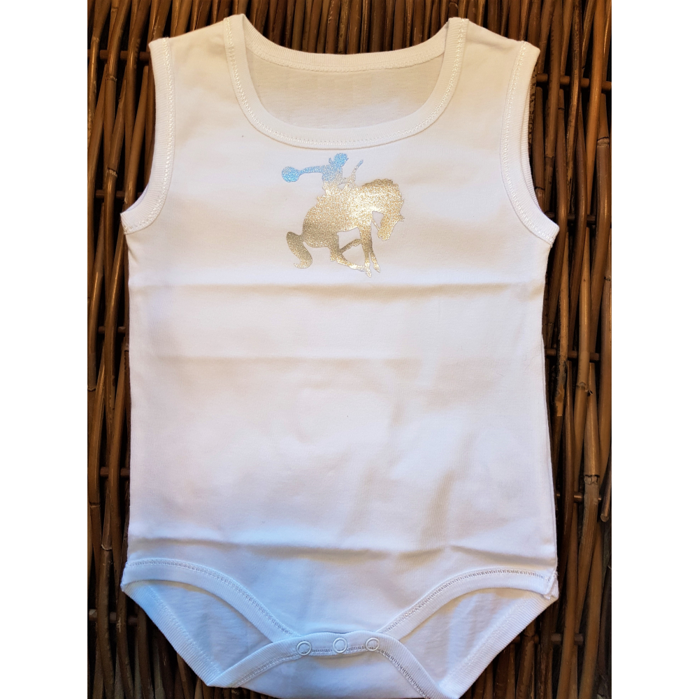 Lief rompertje met een paard;en een cowboy;erop Machine wasbaar op 30graden. Verkrijgbaar in de maten: * 50/56 *62/68 *74/80 *86/92 *98/104