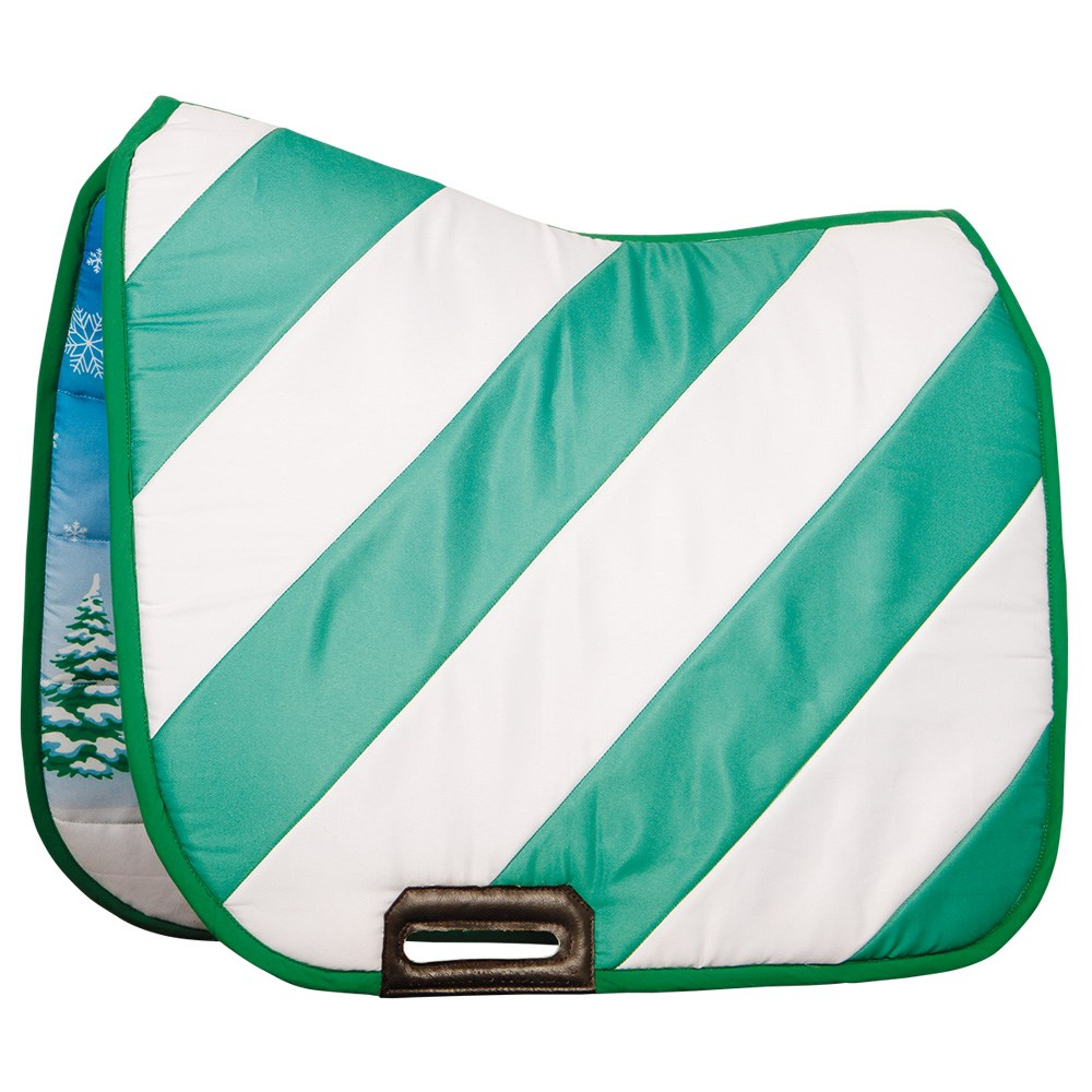 Zadeldek welke aan twee kanten te dragen is, een kant heeft diagonale strepen en de andere kant is met een grote, all-over Kerst-print.TC met foamamp;polyfill vulling MAAT DRESSUUR