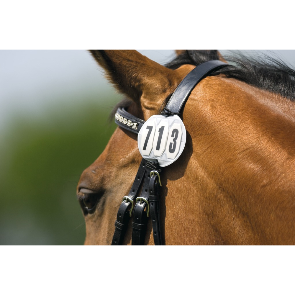 Rund aus weißem PVC, mit 3 transparenten Fächern mit den Zahlen 0 bis 9. Mit doppeltem Gummiband und Haken an den Backenstücken der Trense zu befestigen. Preis ist pro Stück.