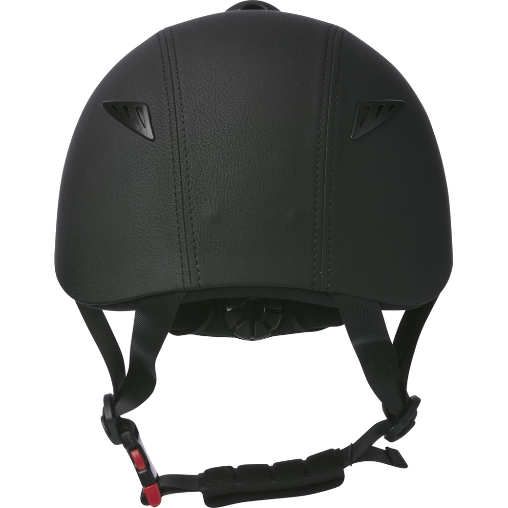 Modieuze rijlhelm, gemaakt van imitatie leer. Korrelig polyurethaan bekleede schaal en chroomkleurige ventilatie stukken aan de voorkant. Verstelbaar door middel van draaischijf aan de achterzijde. Let op! Het middenplaatje lijkt op de foto zwart, deze is zilver/groom kleurig!