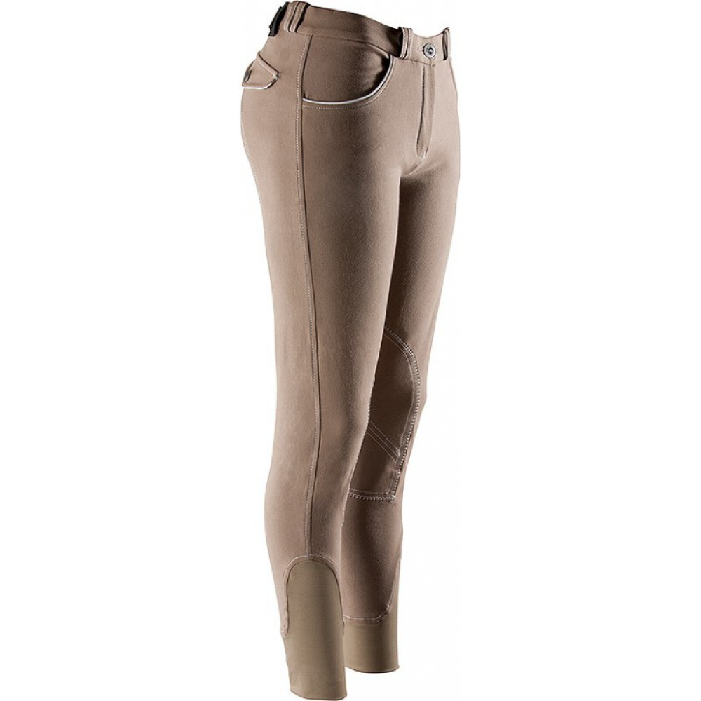 Een broek voor het gehele jaar door van ademende en elastische 60% katoen, 33% polyamide en 7% elasthaan. Contrasterende stiksels langs de contouren van de benen en om de gevormde zit en kniestukken te onderlijnen. Jeans zakken aan de voorkant en klepzakken met drukknopen aan de achterkant, allemaal versierd met contrasterende bies. Elastische anti-slip band met dubbele riem lussen. Brede riemlus met een plaatje aan de achterkant: metalen plaat versierd met strass op een glitter achtergrond voor het dames model en metalen plaat op een synthetische achtergrond voor heren. Stretch onderbeen van dubbeldik elasthaan om gemakkelijk in te stappen en om te verzekeren dat het blijft zitten zonder enig hinder. Machine wasbaar op 30°C.