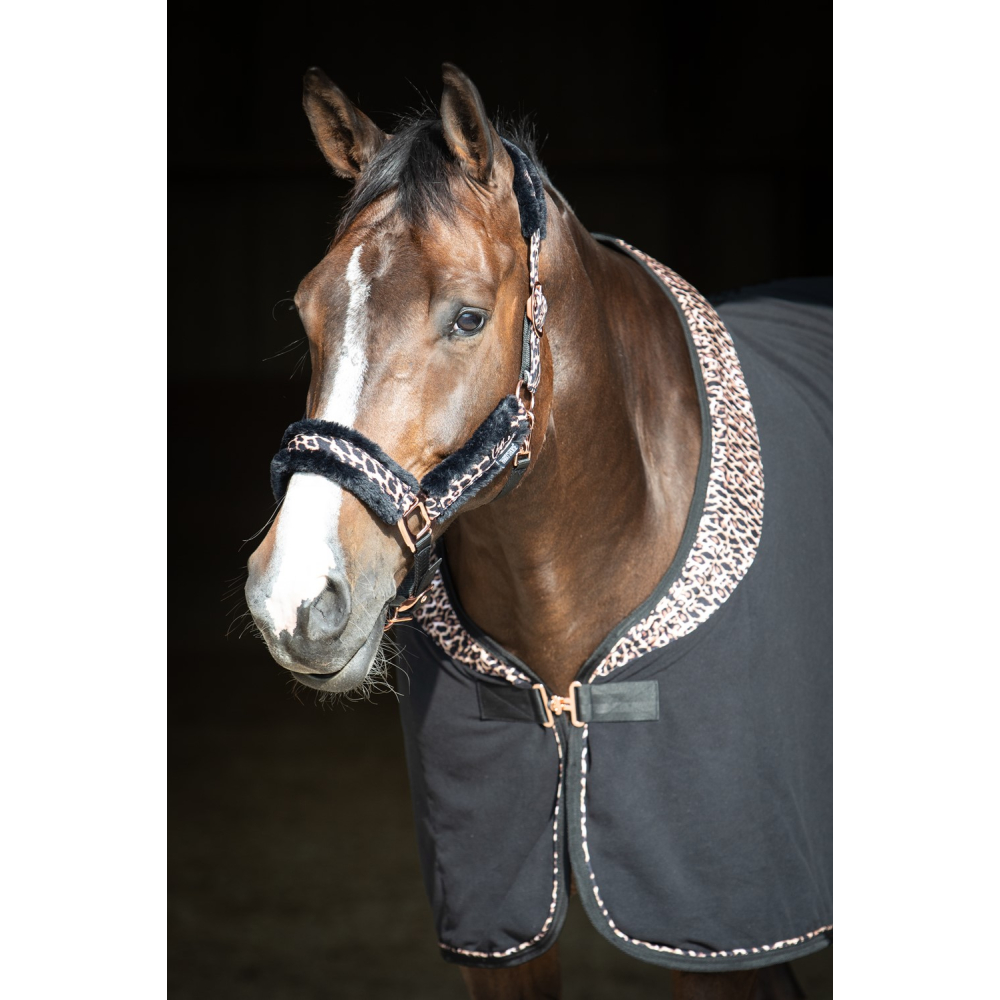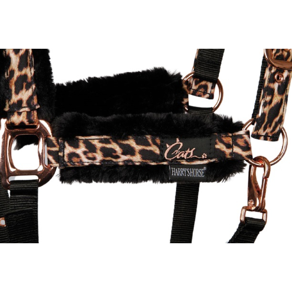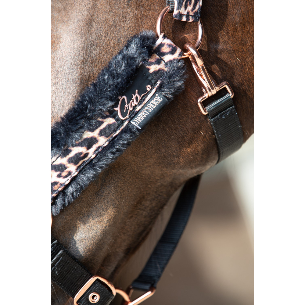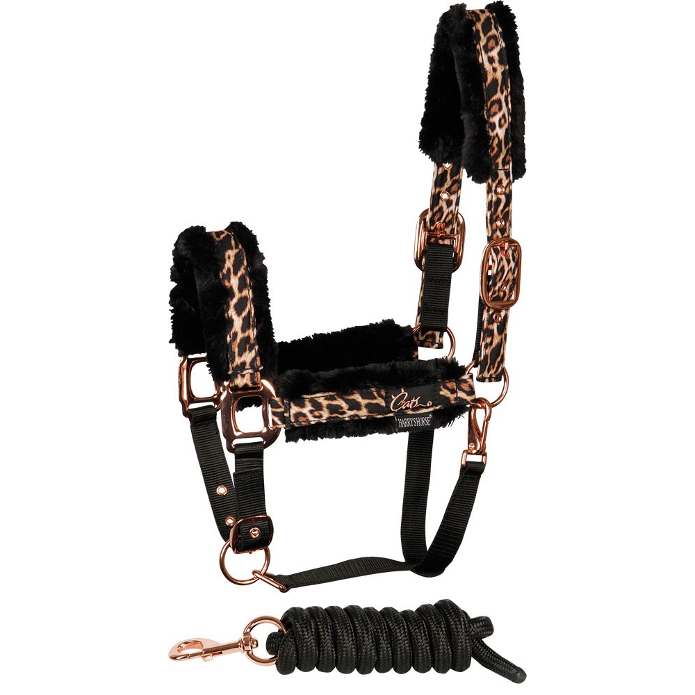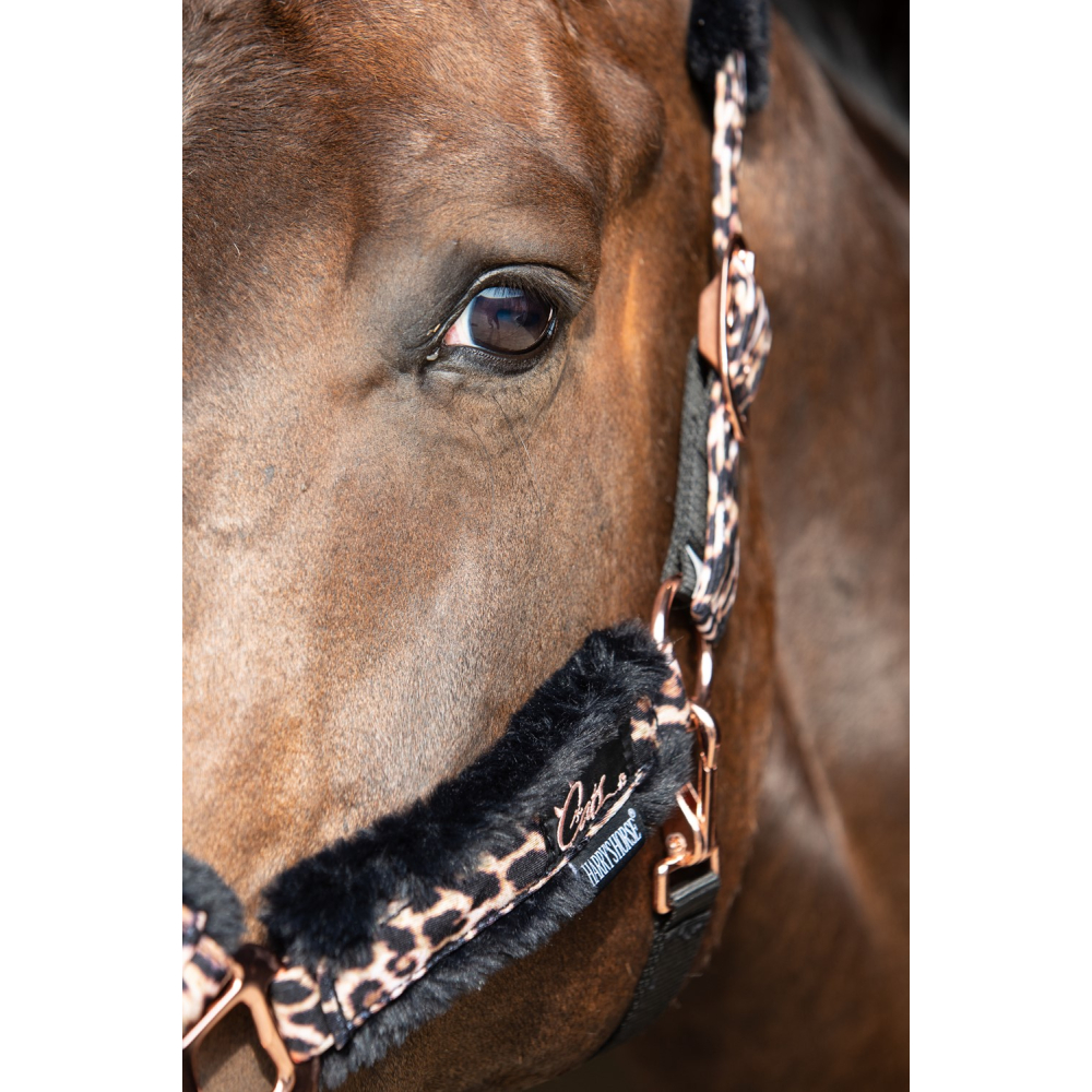 Halfterset mit Aufdruck. Mit wunderschöner Rosegold Kurzwaren. Gepolstert mit schwarzem Kunstfell unter dem Kopfschmuck, dem Nasenband und den Backenstücken für zusätzlichen Komfort. Auf beiden Seiten des Kopfstücks und am Kinn verstellbar. Clipverschluss am Kiefer. Inklusive Anbindestrick.