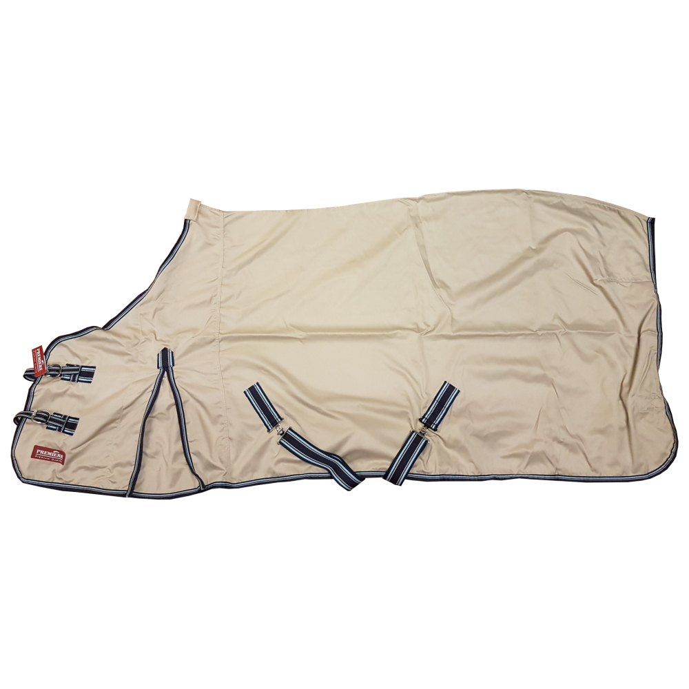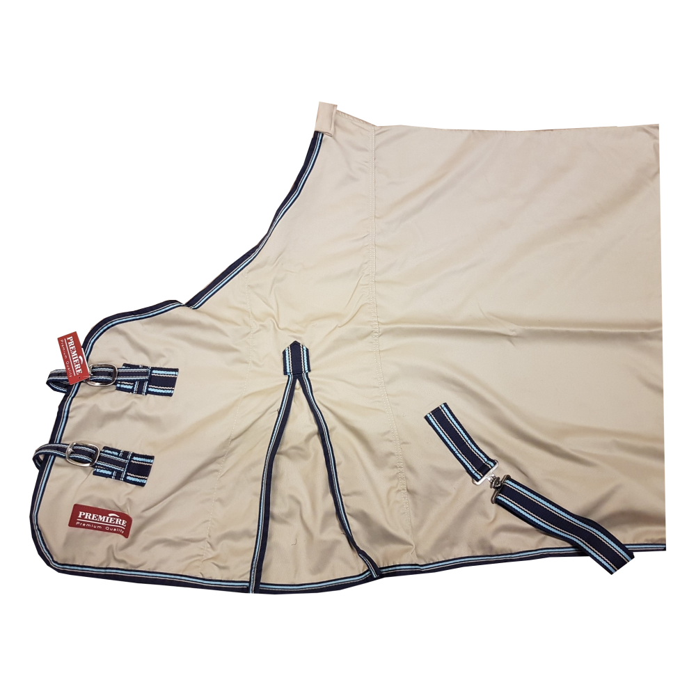 Premiere zomerdeken Buitenzijde: polyester katoen (50% polyester / 50% katoen)Voering: 190T nylon (borst)Fournituren: zink met chroom finish; Verstelbare, dubbele borstsluiting; Loopsplitten; Dubbelgestikte rugnaad; Fleece schoftbeschermer and staartkoord; Verstelbare kruissingels en verstelbare, afneembare, elastische bilkoorden