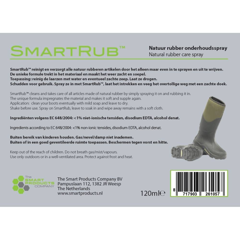 SmartRub reinigt und pflegt alle Naturkautschukartikel, indem es einfach eingesprüht und abgerieben wird. Die einzigartige Formel zieht in den Gummi ein und macht ihn wieder weich und geschmeidig. Anwendung: Reinigen Sie die Stiefel mit Wasser und ggf. milder Seife. Lass sie trocknen. SmartRub vor Gebrauch schütteln. Sprühen Sie den Gummi mit SmartRub ein, lassen Sie ihn einwirken und wischen Sie den Überschuss mit einem weichen Tuch ab..