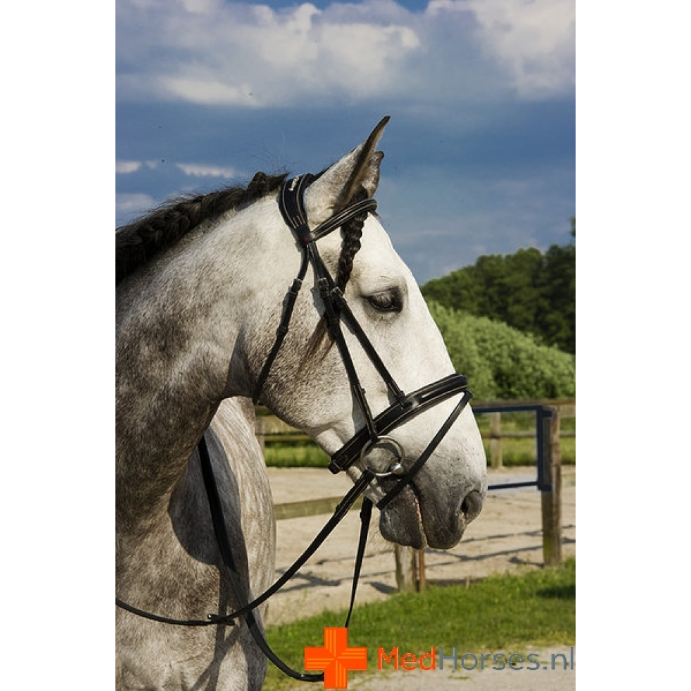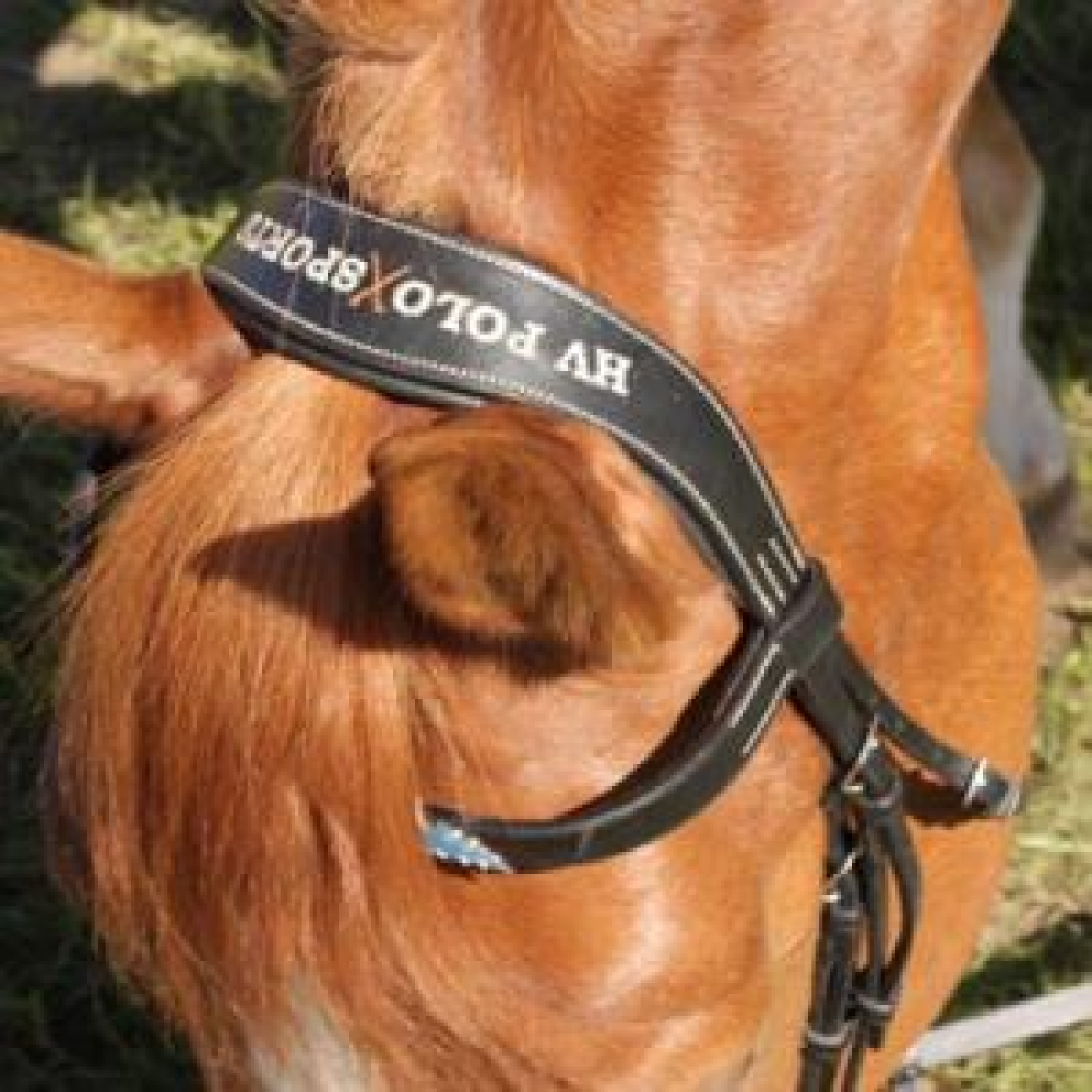 Buffellederen hoofdstel met geborduurd, breed, anatomisch gevormd kopstuk dat opgevuld en gevoerd is met soepel vaarsleder. Rond gebombeerde frontriem en neusriem met geborduurd logo erop, opgevuld en gevoerd met soepel vaarsleder. Sluiting van de bakstukken en teugels met haken. Gecombineerde neusriem, rubberen teugels. Roetsvrijstalen gespwerk voor de zwarte en glimmend messing voor het havanna hoofdstel.
