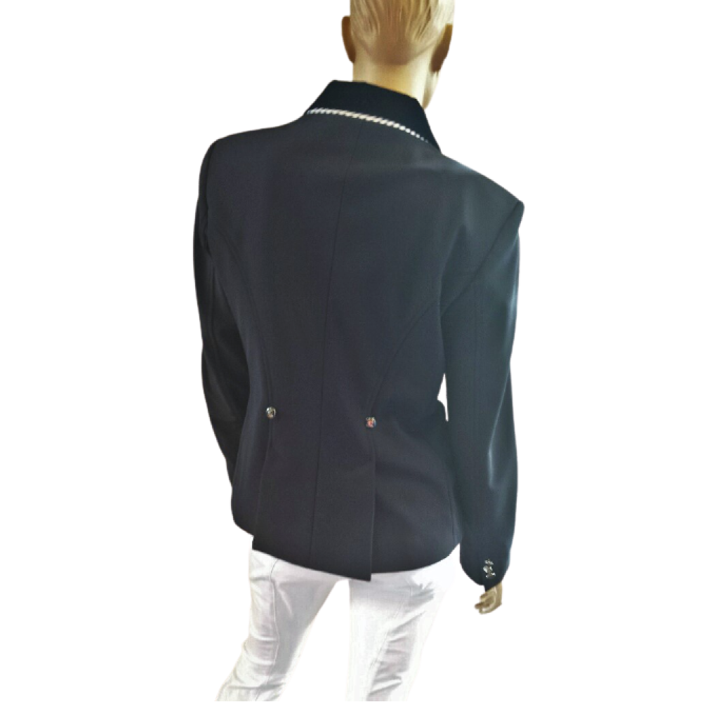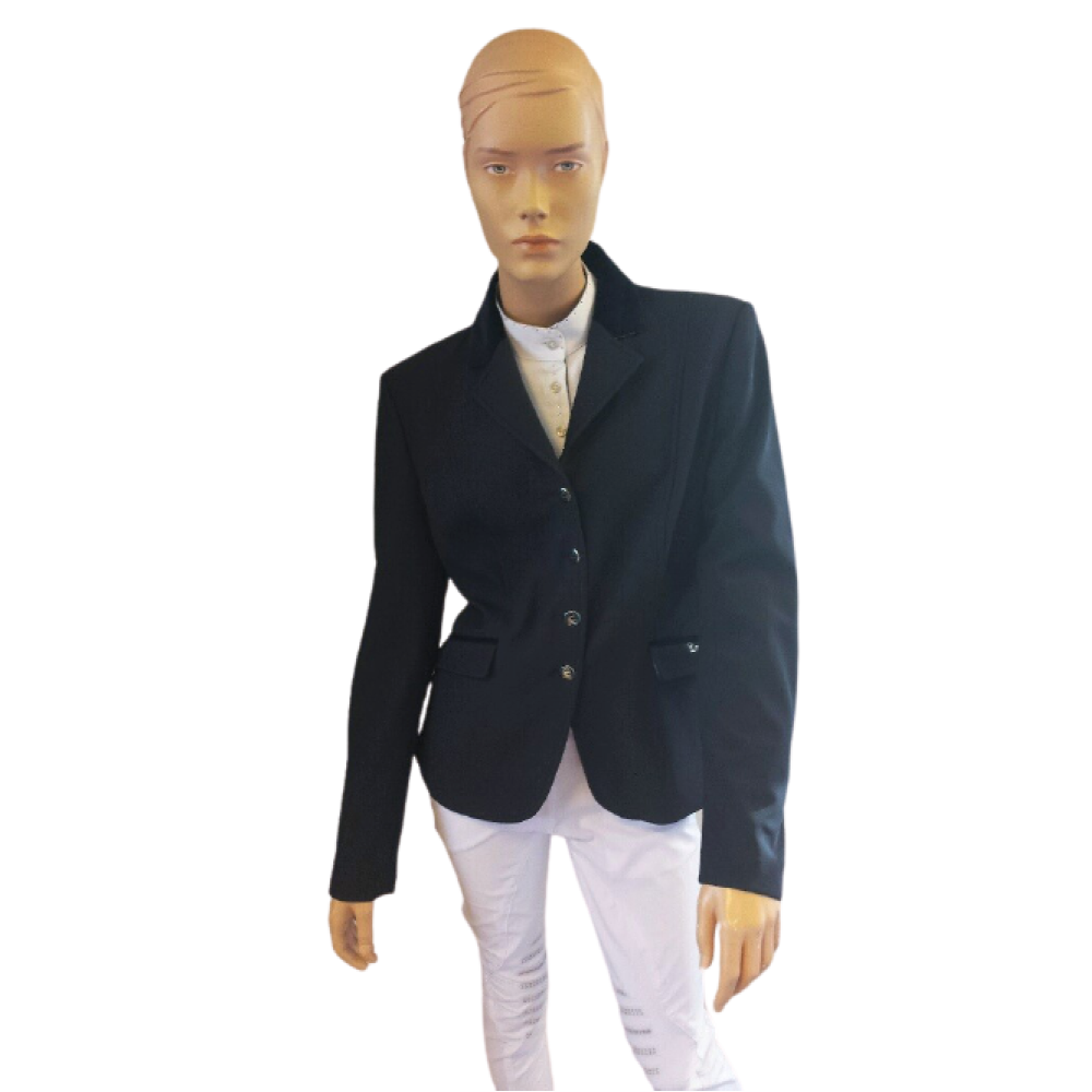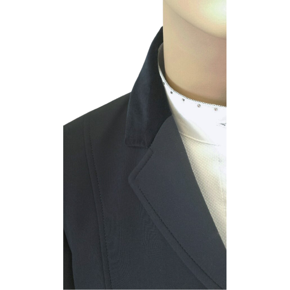 De Galathea Sport Softshell is een wedstrijdjas van Cavallo. Deze modieuze, kort model wedstrijd jas is getailleerd en heeft 2 zakjes aan de voorzijden, waarvan de linker functioneel is. Op het linker zakje is het logo van Cavallo subtiel geborduurd. Deze Galathea Sport heeft een fluwelen kraag. Materiaal: Softshell. Deze stof is waterafstotend. Kleur: Marine blauw Maat: 40 U kunt deze jas vergelijken met andere Galathea Sport modellen. U kunt deze jas namelijk zelf samenstellen en bestellen. U kunt hetvolgende zelf samenstellen op bestelling: <ul> <li>De kleur van de jas</li> <li>Soort stof</li> <li>Wel of geen fluwelen kraag</li> <li>koord of glitter bies langs kraag (Bij koord kunt u verschillende kleuren kiezen)</li> <li>Knopen</li> </ul> De op de website getoonde modellen zijn direct leverbaar, zelf samenstellen enkel op bestelling. Neem voor meer informatie contact op met de winkel