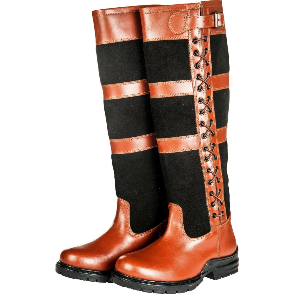 Stijlvolle, duurzame;maar stoer bruine laars gemaakt van kwaliteitsvol leder. De laars is aan de binnenzijde compleet gevoerd (geen teddy) Aan de bovenkant heeft deze rijlaars een gesp. Aan de buitenzijde van de schacht zit een elastische veter, aan de binnenkant is deze veter afgedekt met elastiek De HKM Milano laars heeft een waterdichte, synthetische;antislip zool. De binnenvoering van de laars is gemaakt van synthetisch materiaal en het bovenmateriaal vervaardigd uit kwaliteitsleder Beschikbaar in maat 36 - 44