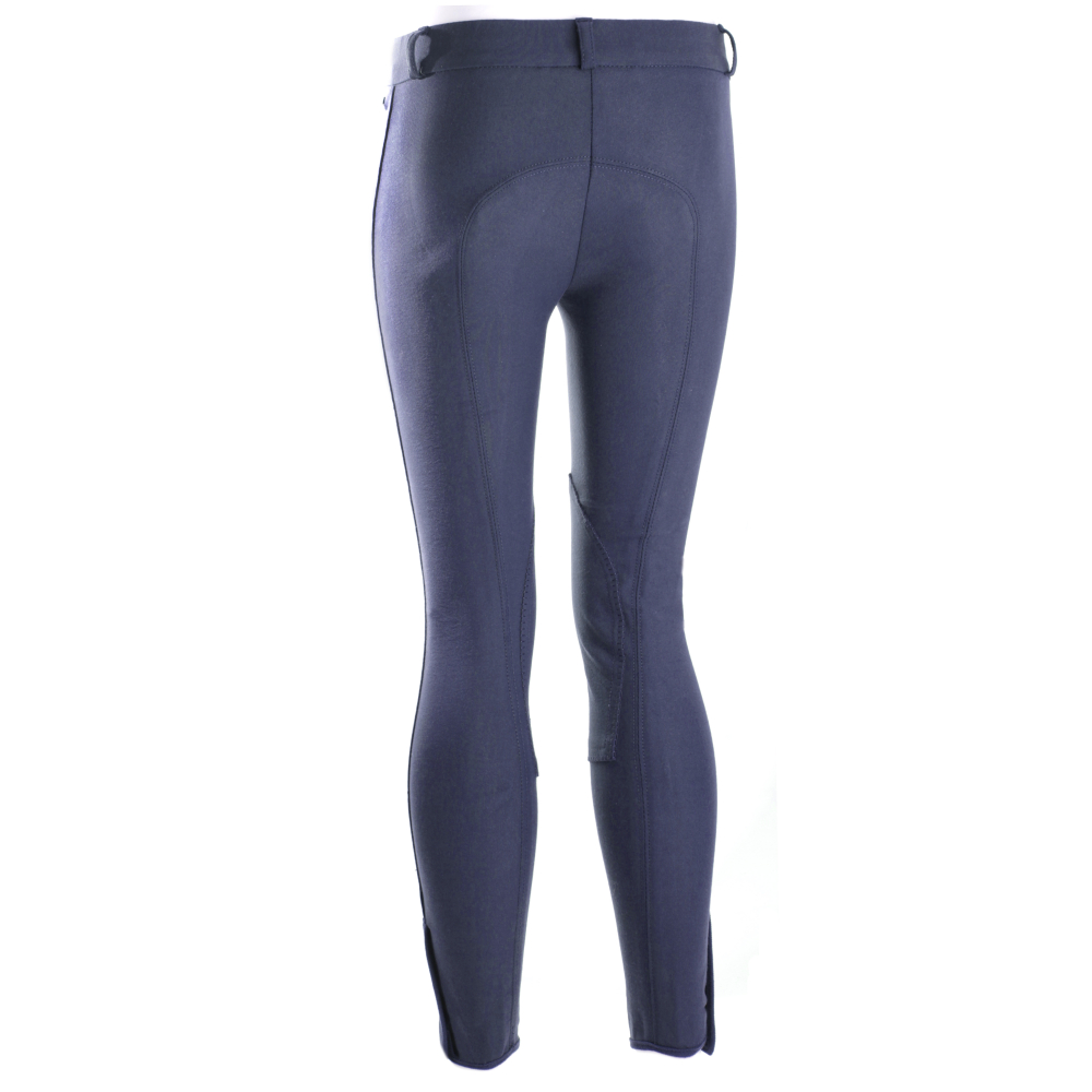 Strak model kinderrijbroek met aan de voorkant een ritszakje. De broek is voorzien van stoffen kniestukken (SKP), een rondgenaaid zitvlak en een klittenbandsluiting aan het uiteinde van de broekspijp. Vervaardigd van 58% katoen/ 34% nylon/ 8% Lycra, geweven kwaliteit.