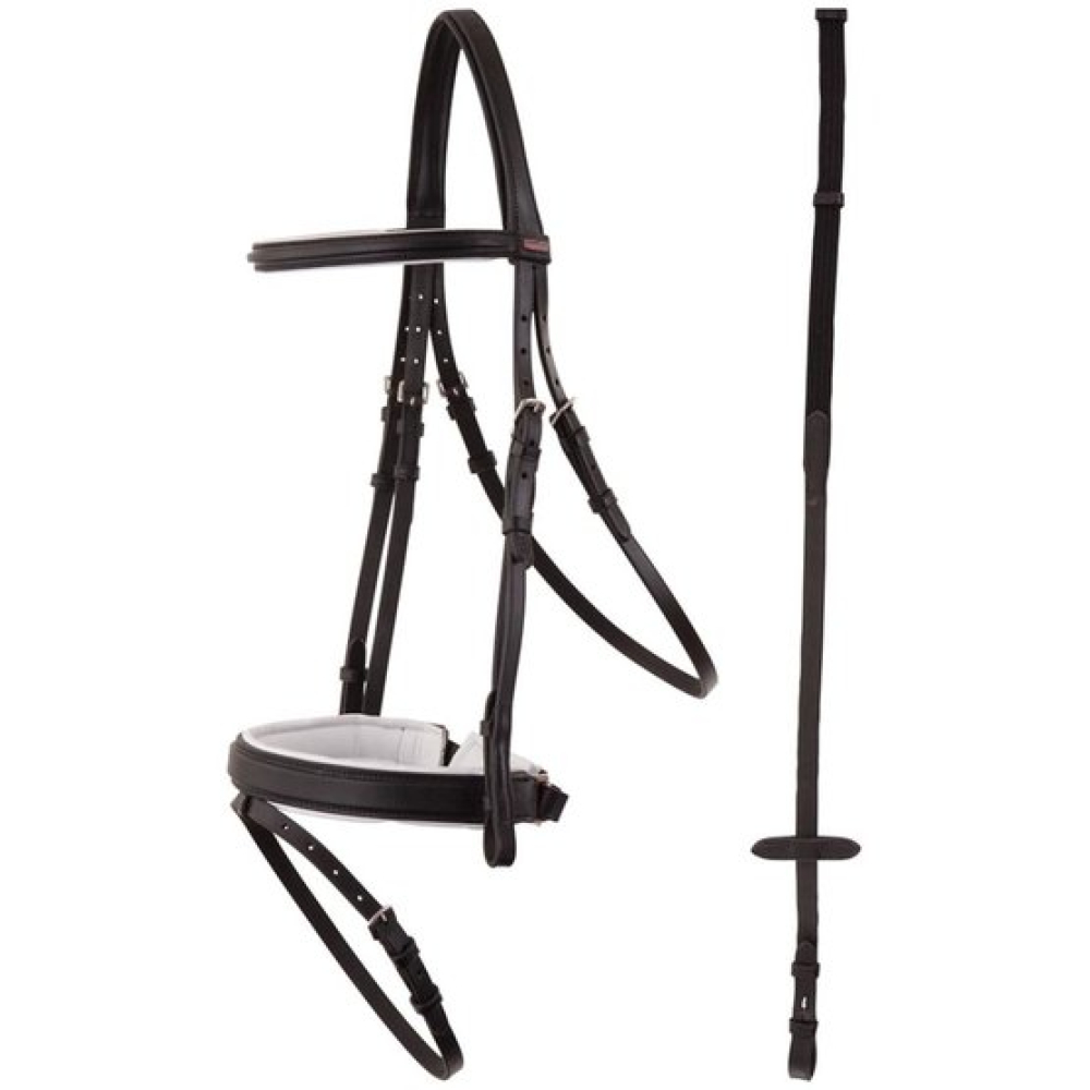 Symmetrisch hoofdstel met een anatomisch gevormd, zacht gevoerd kopstuk dat aan beide zijden is teruggesneden voor extra vrijheid. Het zacht gevoerde, rechte frondeel is vierkant gebombeerd. De brede (circa 4 cm) gecombineerde aansnoerneusriem is vierkant gebombeerd, zacht gevoerd en is voorzien van een zacht gevoerde kaakbeschermer. De bakstukken zijn voorzien van blinde sluitingen. Het hoofdstel is voorzien van roestvrijstalen fournituren Dit hoofdstel is wit onderlegd De bijgeleverde linnen teugel heeft hand- en teugelstops en blinde sluitingen
