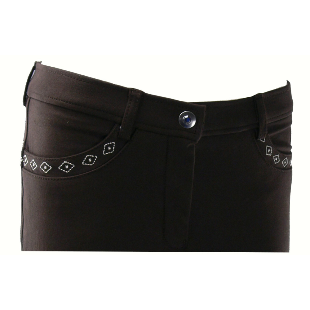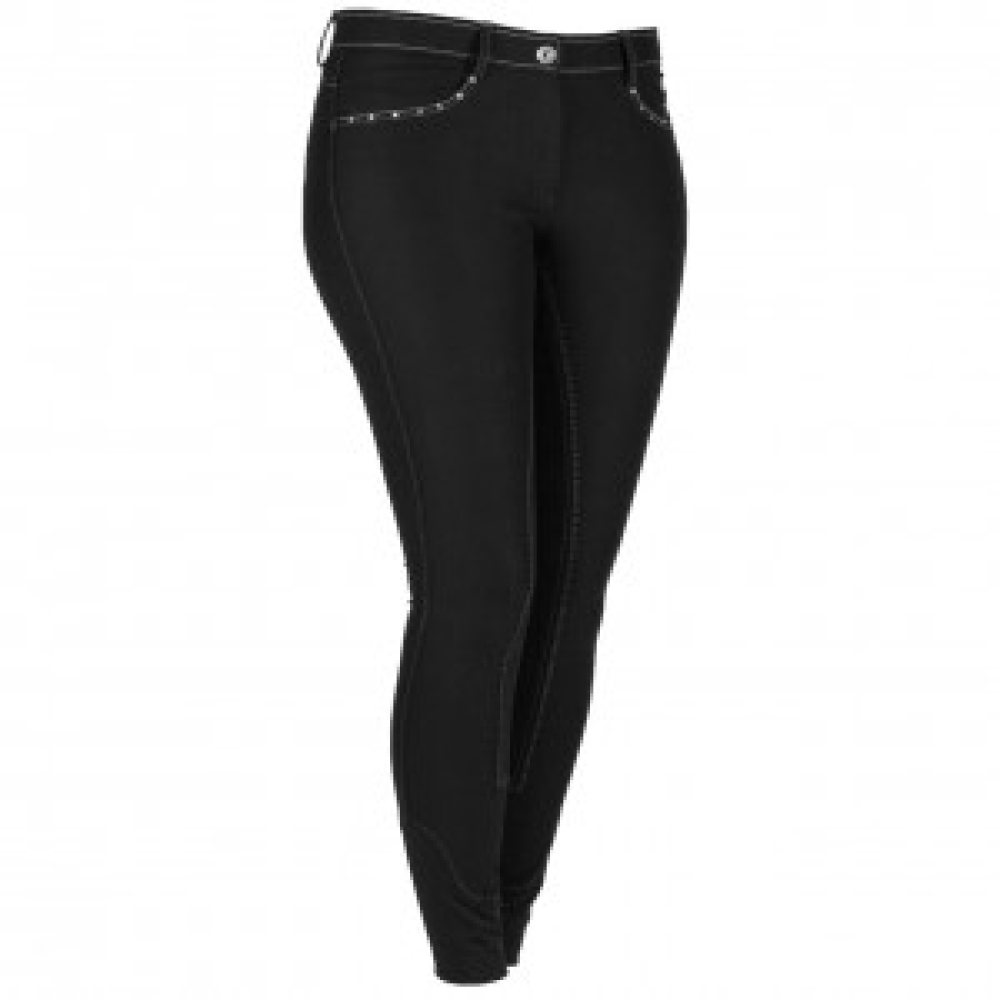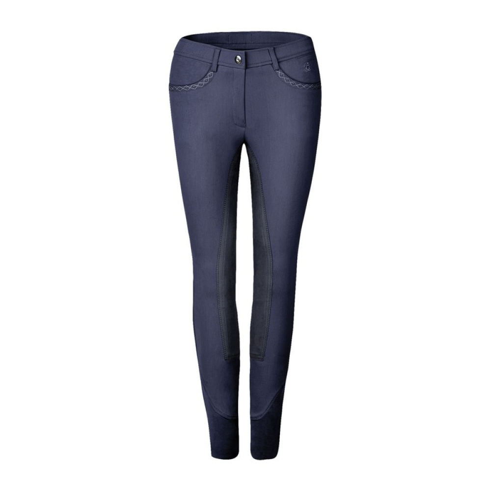 De Cavallo Calla is een stijlvolle dames rijbroek. De rijbroek is voorzien van een leren zitvlak en heeft lycra stof bij de enkels. Aan de voorzijde heeft de rijbroek 2 steekzakken. De steekzakken zijn voorzien van een zilverkleurig ruitpatroon met zilverkleurige stip, dit patroon loopt door over de achterzijde.