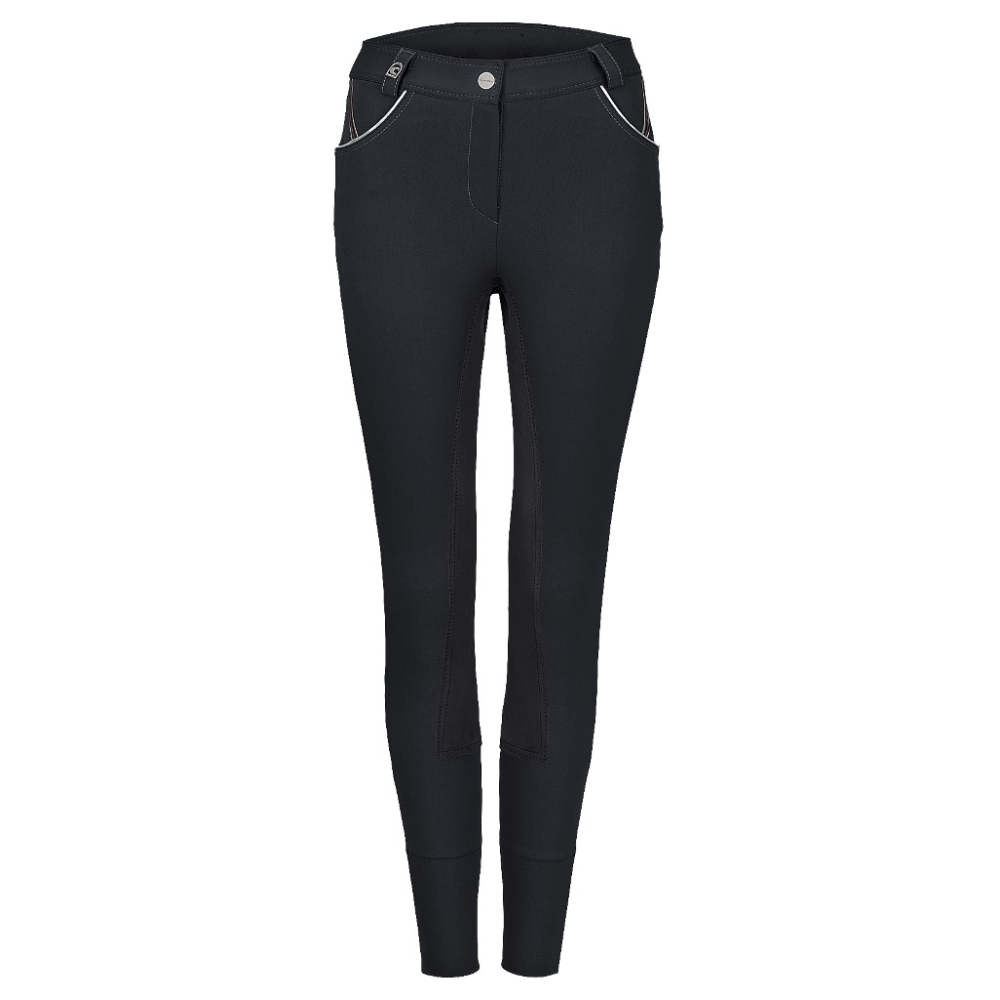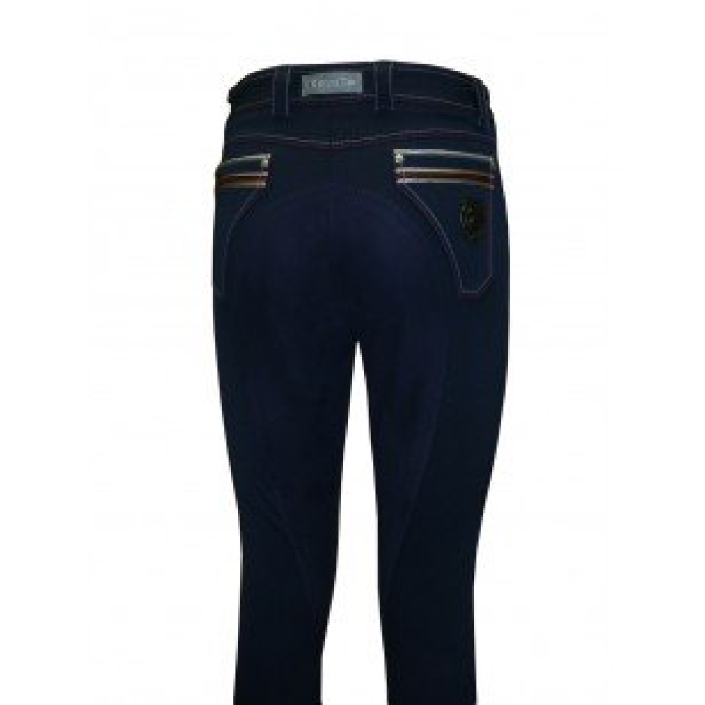 Pantalon d'équitation sportif et tendance, orné d'un passepoil argenté le long des poches. Il présente également des surpiqûres contrastées rouge et argent. Il possède deux poches fendues sur le devant et deux poches arrière, ornées d'un passepoil argenté et de surpiqûres contrastées. Un petit badge orne également la poche arrière droite. Fabriqué en tissu Cavallo Micro Premium extensible dans les 4 sens. Fond en similicuir. Fermeture élastique au bas des jambes. Composition : 64 % coton, 29 % polyamide, 7 % élasthanne. ATTENTION ! Ce pantalon est bleu très foncé !