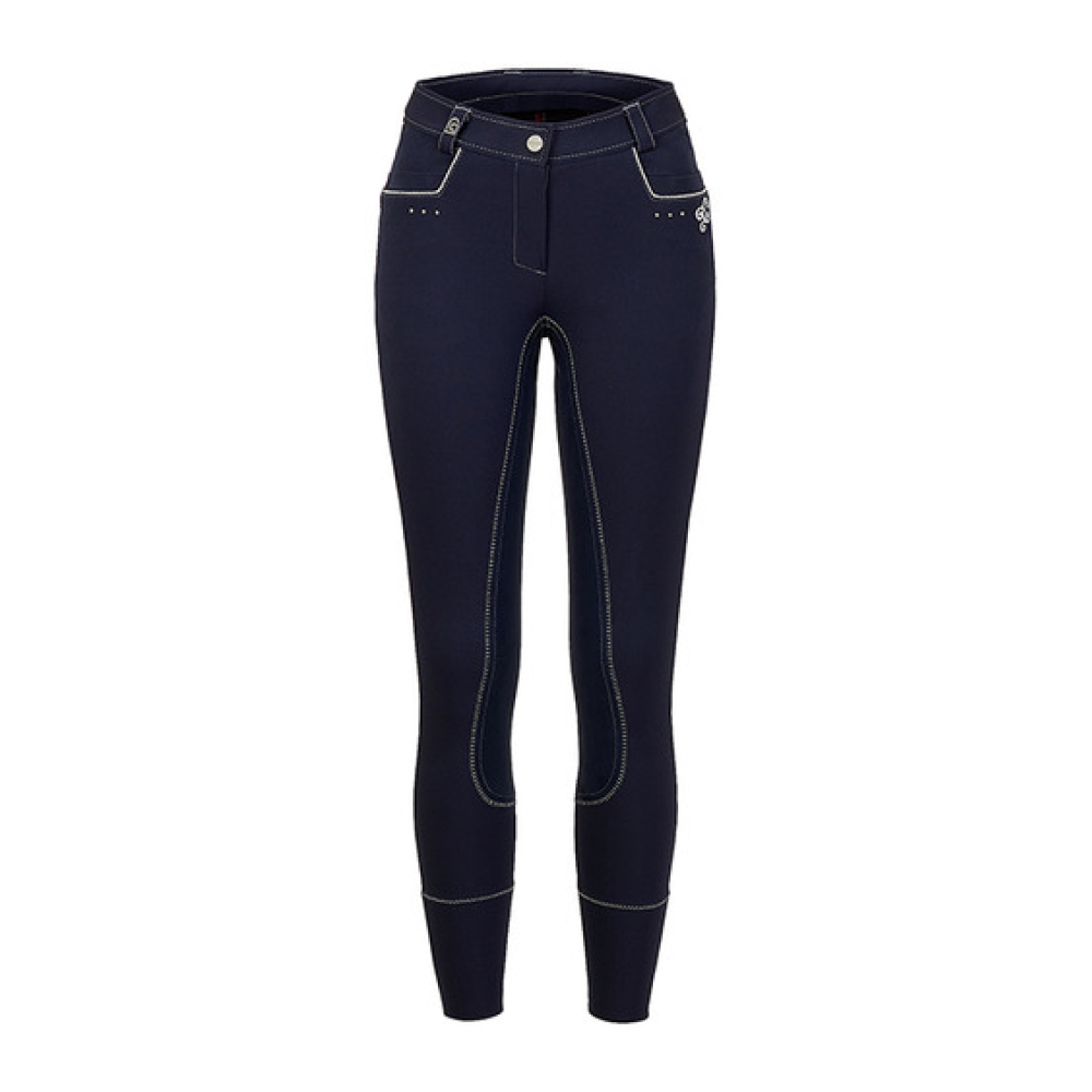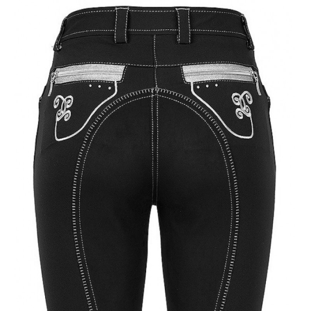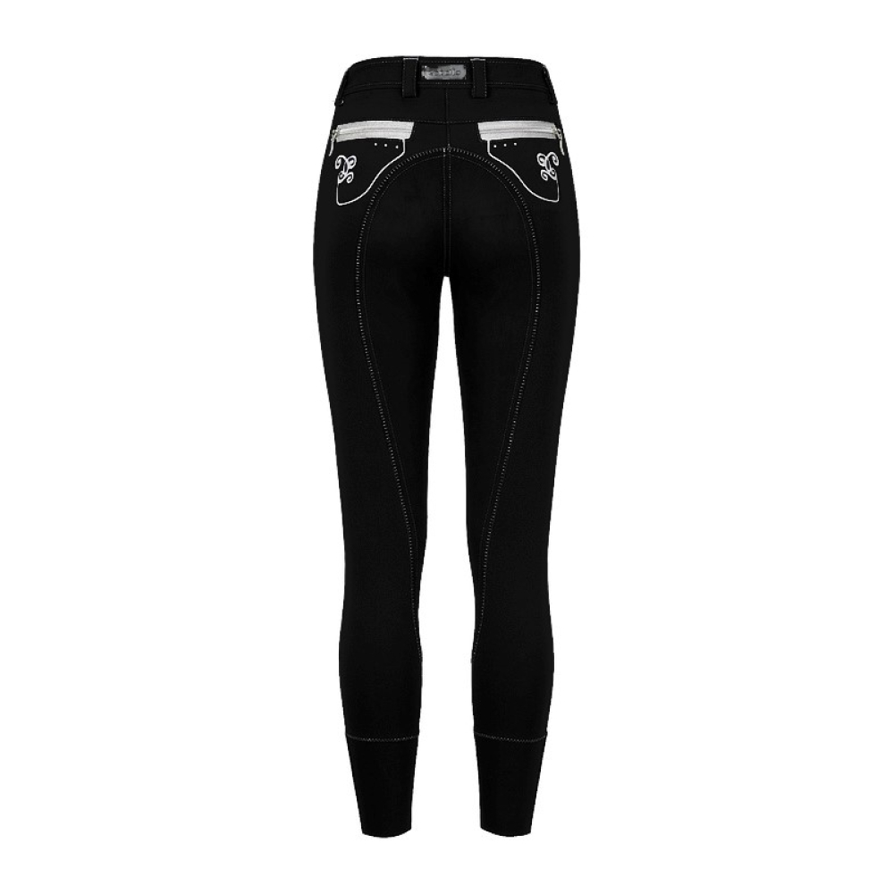 De Cavallo Crystal is een modieuze dames rijbroek. Deze zwarte dames rijbroek is afgezet met grijs stiksel. Aan de voorzijde heeft de broek 2 steekzakken welke zijn afgezet met een zilvere bies. Onder deze zakken zitten 3 kleine studs en een krullende opdruk. Aan de achterzijde heeft de Cavallo Crystal 2 ritszakjes, deze ritsen zijn zilverkleurig en afgewerkt met zilveren inzet. Aan de onderzijde van deze zakjes zitten wederom 3 kleine studs en een krullende opdruk. Deze broek heeft een kunstlederen zit Materiaal: 64% cotton, 29% polyamide, 3% elastane