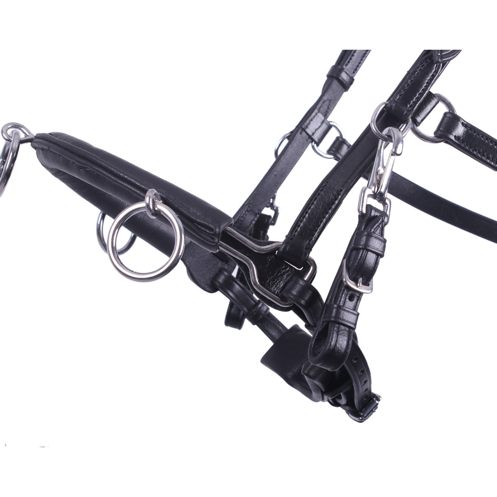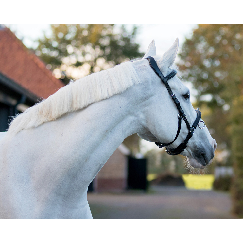Caveçon multifonctionnel en cuir qui peut aussi servir de bride. Grâce aux clips amovibles, le cavesson peut être utilisé avec ou sans mors. Trois anneaux sont attachés à la muserolle à laquelle une longe peut être attachée. Équipé d'une têtière de forme anatomique.