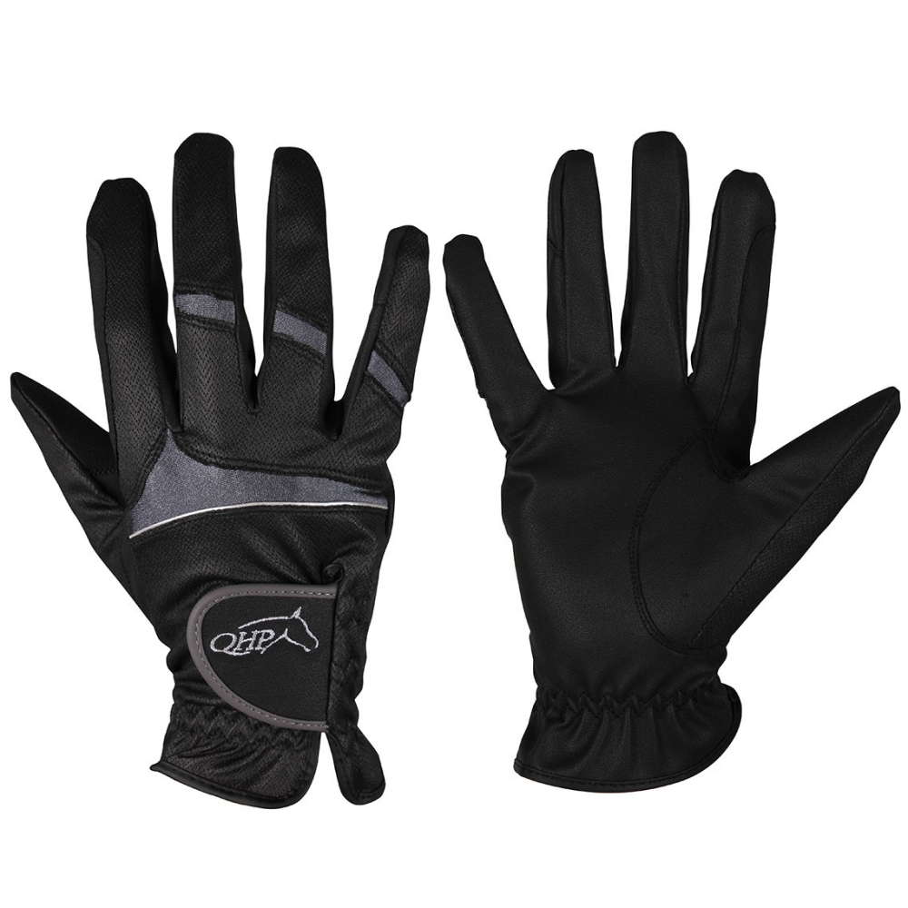 Deze luchtige handschoen is perfect om te dragen met warm weer. De stof op de rug van de hand is geperforeerd met miniscule gaatjes en de elastische stof op de knokkels is extra dun. Zo heb je ook in de zomer extra grip op de teugel maar blijven je handen koel. Materiaal: polyurethaan, spandex Handschoen speciaal voor de zomer Bovenkant gemaakt van geperforeerde stof Binnenkant van stevigere stof Met extra dunne stretch inzet op de knokkels en vingers Voorzien van teugelversteviging tussen de ringvinger en pink en tussen de wijsvinger en duim Voorzien van elastisch manchet Klittenbandsluiting met QHP logo borduring