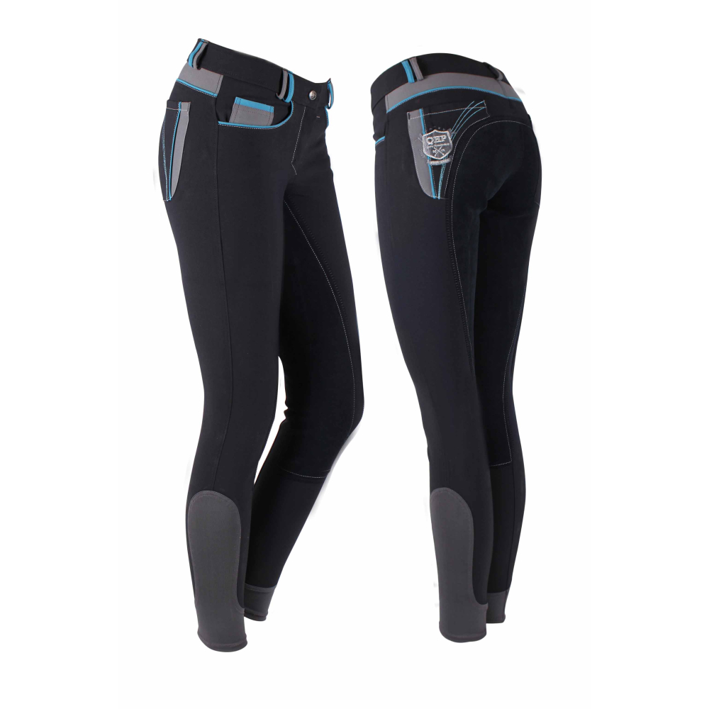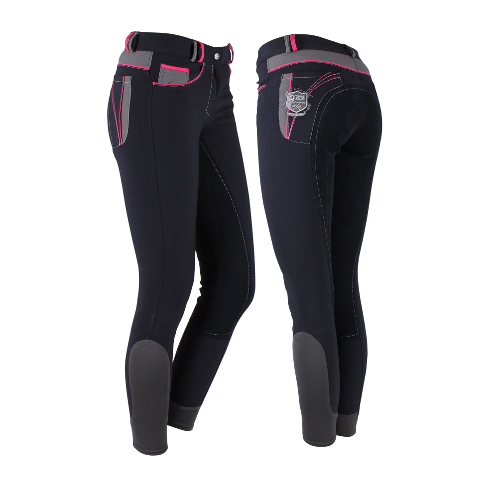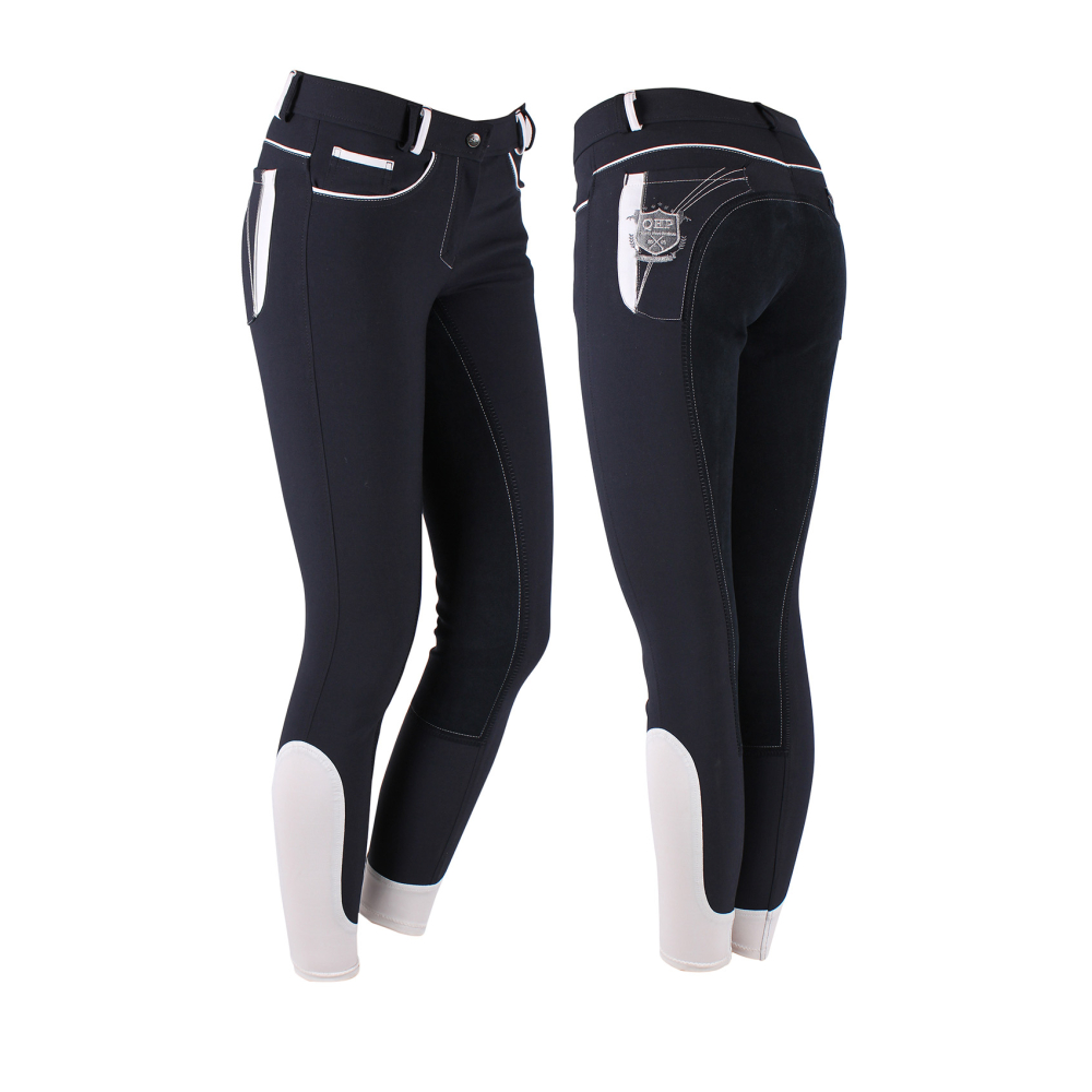 QHP Claire Limited Edition is een laag model dames rijbroek Deze paardrijbroek is afgewerkt met een contrasterende bies en contrasterende kleurvlakken. Deze;rijbroek heeft aan de voorkant 2 steekzakken, waarbij in de rechter steekzak een klein zakje zit. Aan de achterzijde heeft deze rijbroek 2 steekzakken wederom in contrasterende kleuren, waarbij er een badge van QHP is gestikt op de linker steekzak. De broek heeft een kunstlederen inzet De Claire heeft onderaan de broekspijp een elastische beenafsluiting