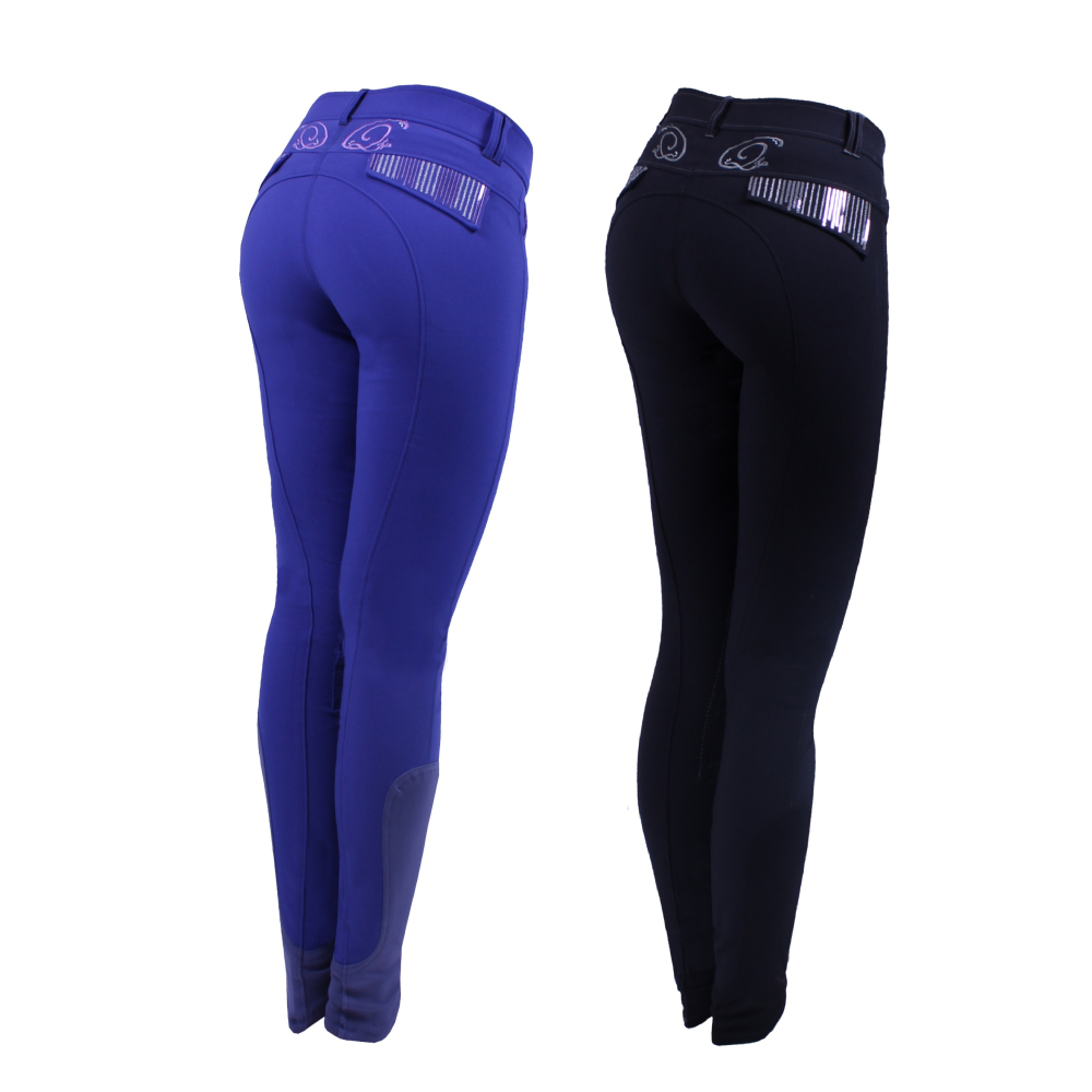 Rijbroek met op de achterzijde sier klepzakjes afgewerkt met pailletjes, met daarboven een luxe borduring. Aan de voorzijde voorzien van steekzakken. De broek heeft lycra beensluitingen. In de kleuren zwart en kobalt (deze gaat richting paars)