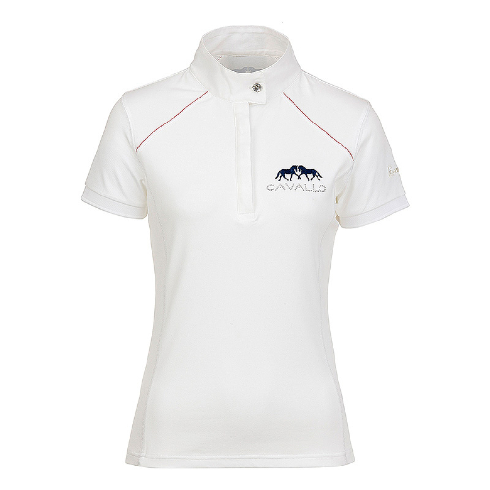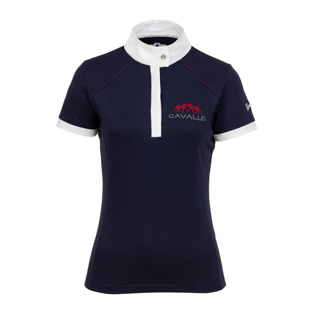Cavallo Della is een modieus wedstrijdshirt met korte mouwen en hoge boord met strass steen. Het shirt is voorzien van contrasterend stiksel en op de linkerborst zijn 2 paarden geborduurd met daaronder Cavallo in strass steentjes. Op het linker mouwtje is het Cavallo logo geborduurd