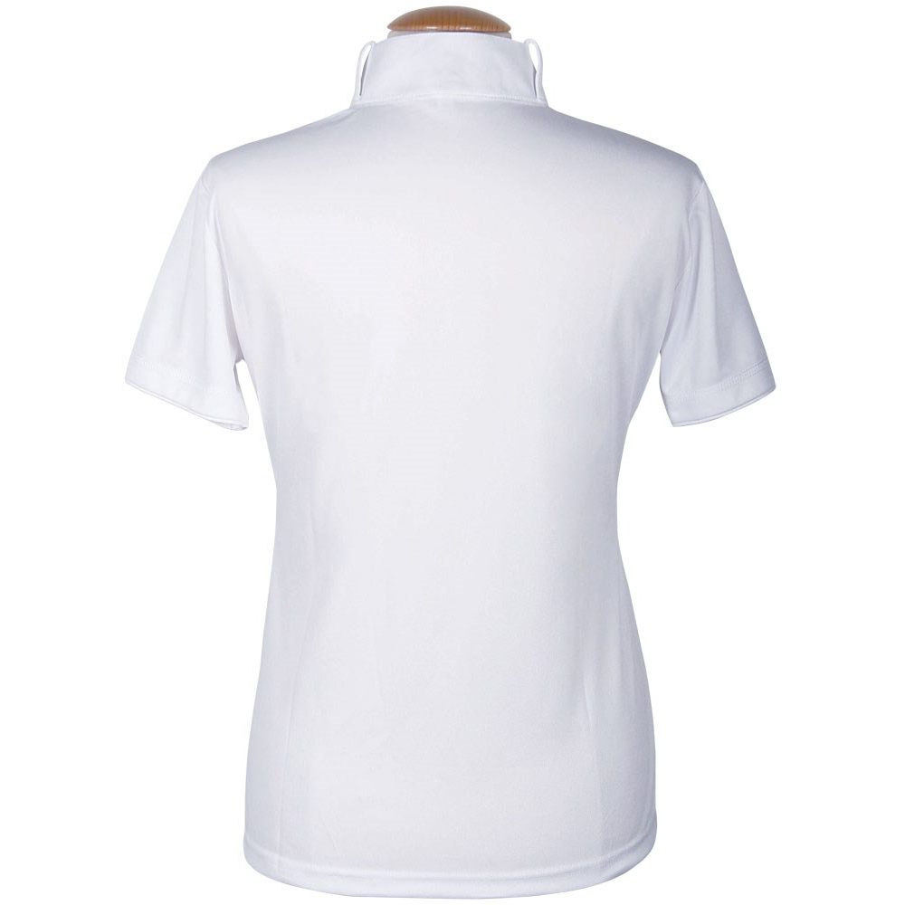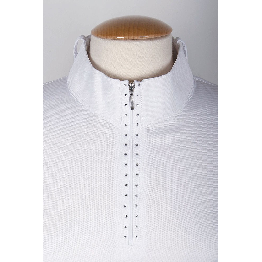 Wedstrijdshirt korte mouw met korte rits en crystallen langs de ritssluiting en plastron lussen100% micro polyester