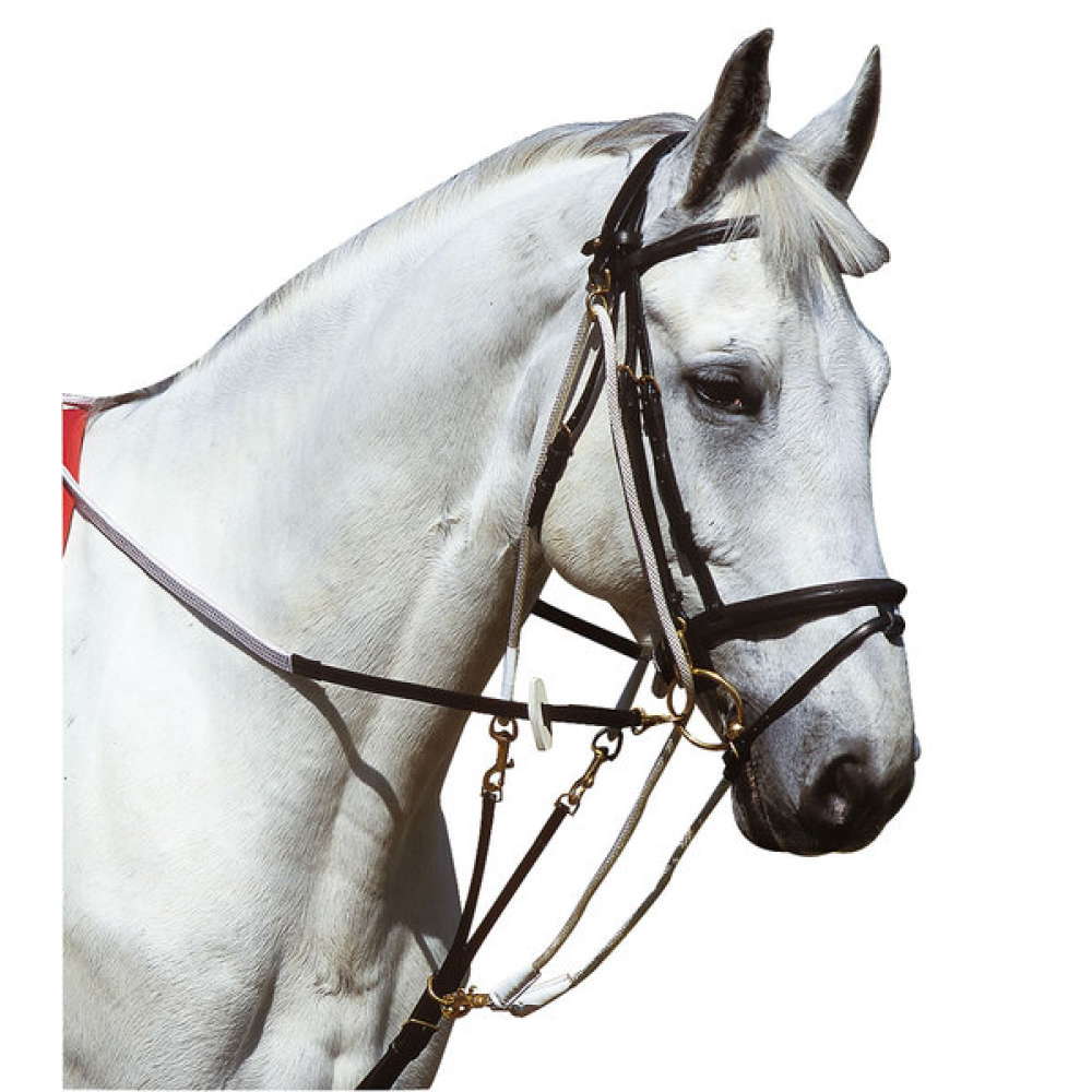 Buffelleder. Gespwerk en pulley's van vernikkeld messing.