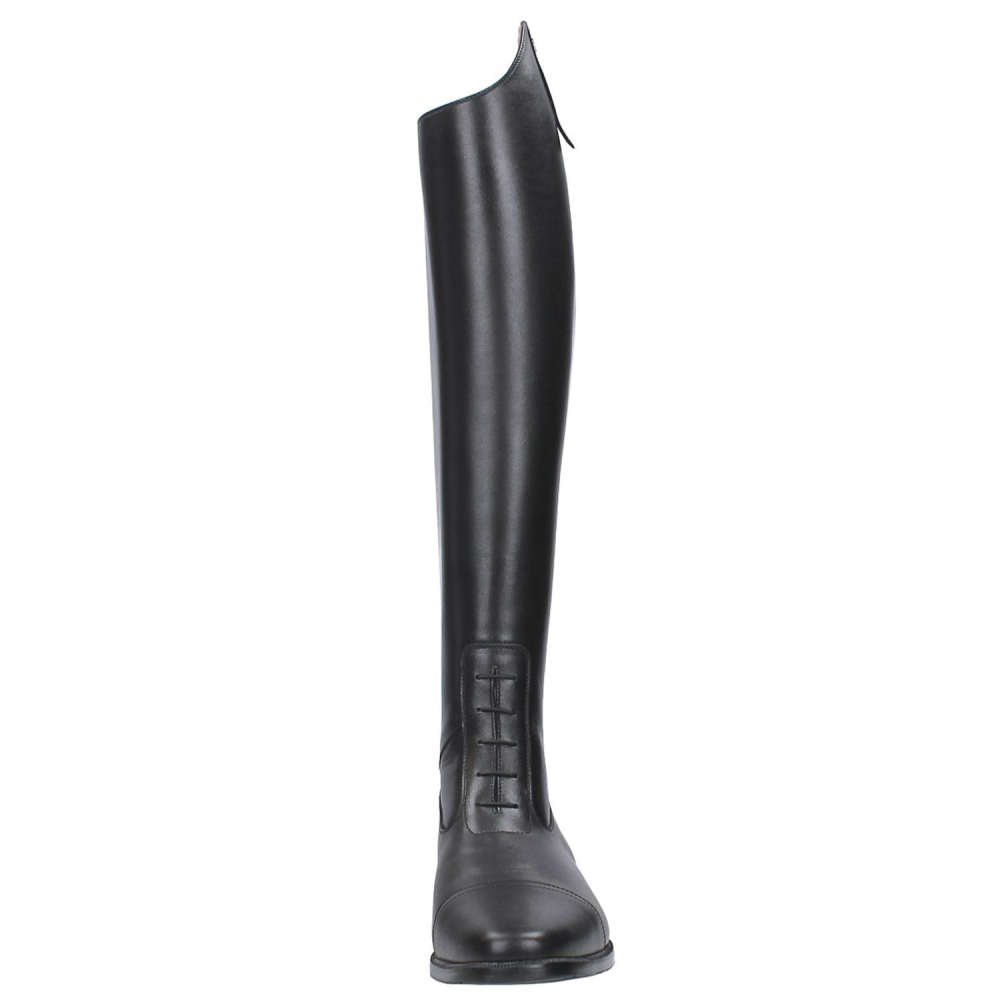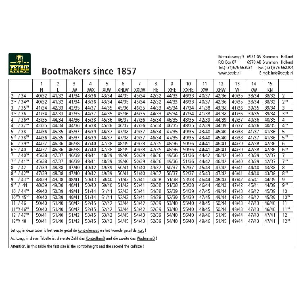 De Coventry van Petrie is een elegante slanke rijlaars welke in het geheel nauw aansluit, ook bij de enkel. Deze rijlaars heeft een elastische vetersluiting op de wreef. De Coventry is een soft rundlederen rijlaars en heeft een ritsluiting aan de achterzijde van de schacht, welke reikt tot aan de AGO-gelijmde rubberen zool. De rits is aan de bovenkant en onderkant afgewerkt met een beschermende drukknoop sluiting. De kap van de laars heeft een boog van 5cm. De laars is met leder gevoerd en heeft een extra comfort voetbed. De Coventry is leverbaar in zwart, bruin en cognac. Ook zijn deze rijlaarzen leverbaar in overige maten. Deze rijlaars heeft de volgende maten: <ul> <li>* Voet = 6</li> <li>* Kuit = 36</li> <li>8 Hoogte = 50</li> </ul> Neem contact met ons op voor andere maten en kleuren of om op maar gemaakte laarzen te bestellen.
