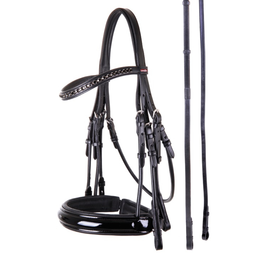 Symmetrisch hoofdstel met een zacht gevoerd kopstuk dat aan beide zijden is teruggesneden voor extra vrijheid. Het licht gebogen frondeel is ingelegd met Black XL imitatie diamanten en is onderlegd met zacht leder. De brede (circa 4 cm) aansnoerneusriem met lakleder is rond gebombeerd en zacht gevoerd en is voorzien van een zacht gevoerde kaakbeschermer. De rondgenaaide bakstukken zijn voorzien van blinde sluitingen. Het hoofdstel is voorzien van roestvrijstalen fournituren Het hoofdstel wordt geleverd met een lederen dressuurteugel (16 mm) met rondgenaaide uiteinden, rubberen binnenzijde, lederen handstops en blinde sluitingen en een glad lederen, stangteugel (13 mm) met rondgenaaide uiteinden en blinde sluitingen