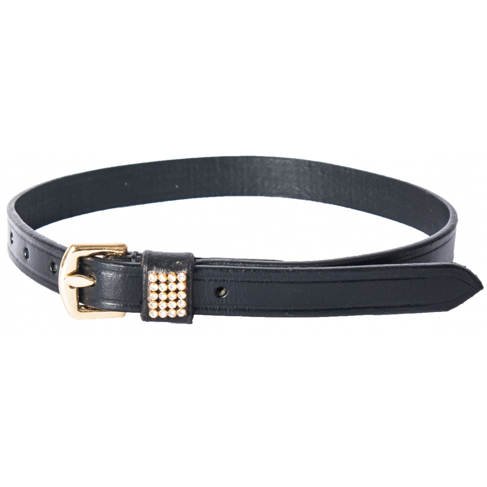 Glad lederen spoorriemen van QHP met strass steentjes bij de sluiting. Messing kleurige gespen