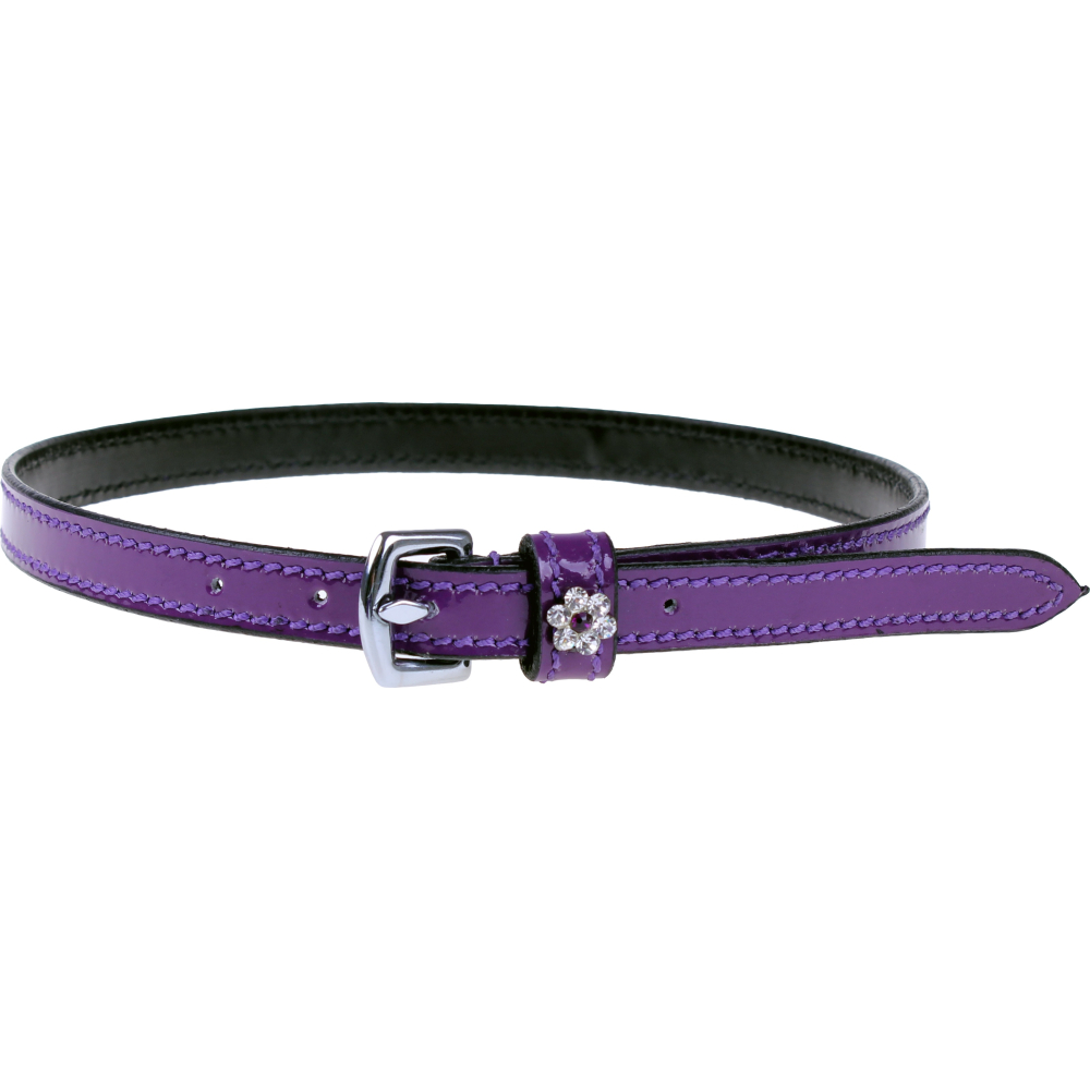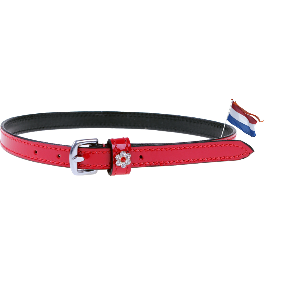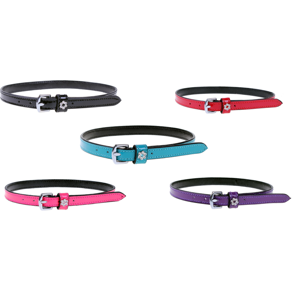 Deze laklederen spoorriemen van QHP genaamd Pluto zijn verkrijgbaar in verschillende kleuren en hebben een strass bloempje bij de sluiting
