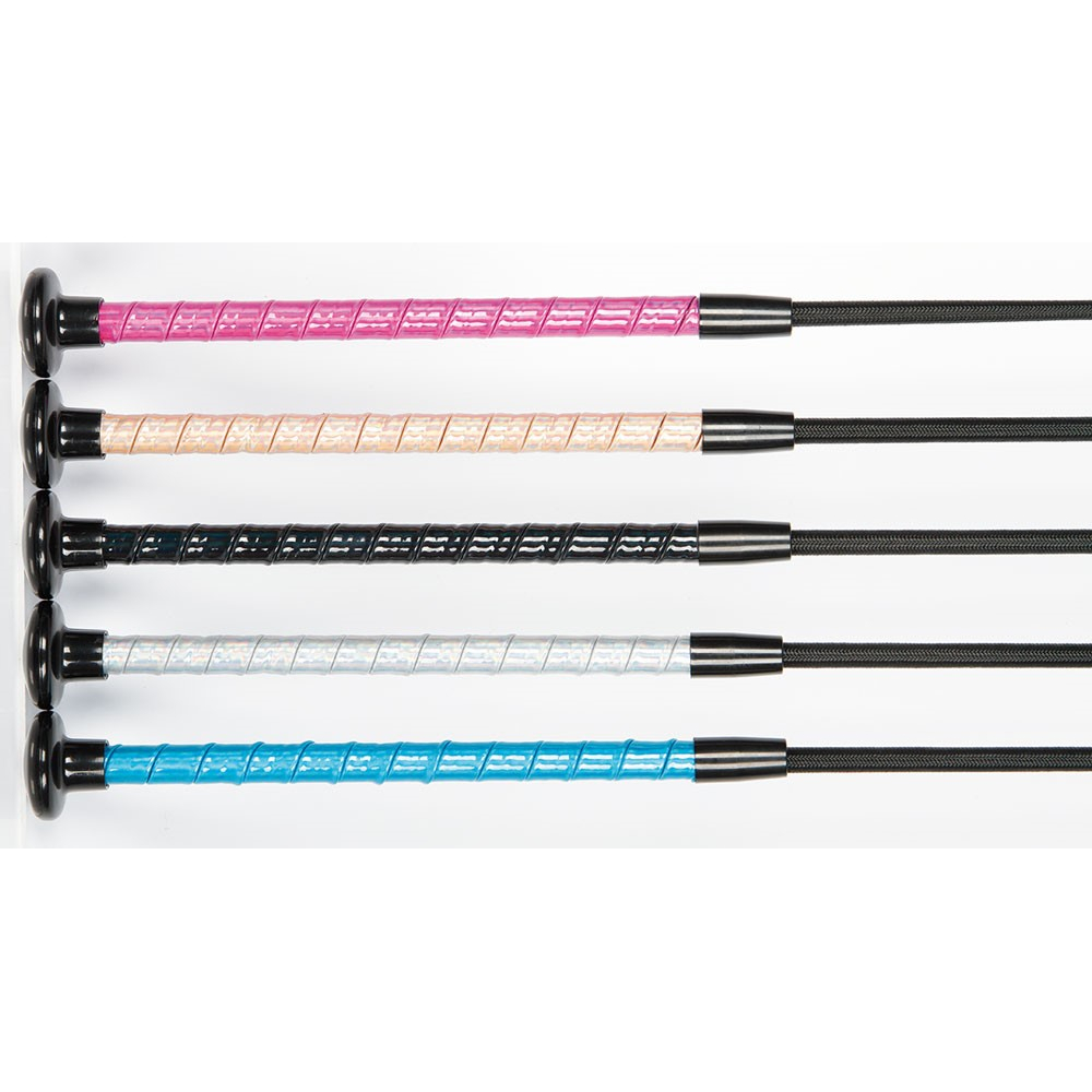 Zwarte zweep met vrolijk gekleurd, Hologram handvat. Voor extra grip en comfort. Beschikbaar in zwart, hologram, rosegold, fuchsia en blauw. Lengte is excl. slag 10cm. LET OP! NEEM VOOR HET VERSTUREN VAN RIJZWEPEN EERST CONTACT OP MET DE WINKEL!