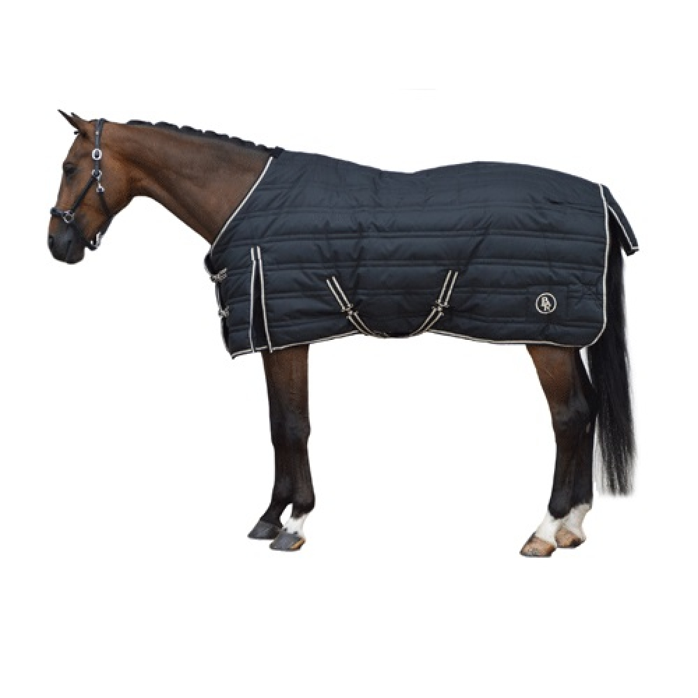 BR staldeken Classic Buitenzijde: 600D polyester Voering: 3/4 Cool Plus met Ciba behandeling en 1/4 nylon (borstgedeelte en onderzijde) Vulling: 300 g polyfill Fournituren: zink met chroomfinish · Anatomisch gevormde staldeken met dubbel gestikte rugnaad · Schoftbeschermer · Dubbele, verstelbare borstsluiting met quick release clips en klittenband · Verstelbare kruissingels en verstelbare, afneembare, elastische bilkoorden · Loopsplitten en een rechthoekig model staartflap Wij raden u aan om deze deken 1 maat groter te nemen dan u gewend bent!
