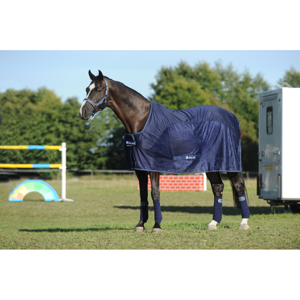 Deze Bucas Competition Cooler is de ideale deken voor op transport. Deze deken heeft de welbekende stay-dry fleece op het ruggedeelte aan de binnenzijde en is aan de zijkant fijn mazig. Door deze samenstelling is de deken luchtig, koelt de rug van het paard na arbeid langzaam af en is deze deken een effectieve vliegendeken. De buitenzijde is glad waardoor stro er niet aan blijft hangen Verkrijgbaar in de volgende kleuren * Blauw * Ochre (Oranje) * Antelope (Beige)