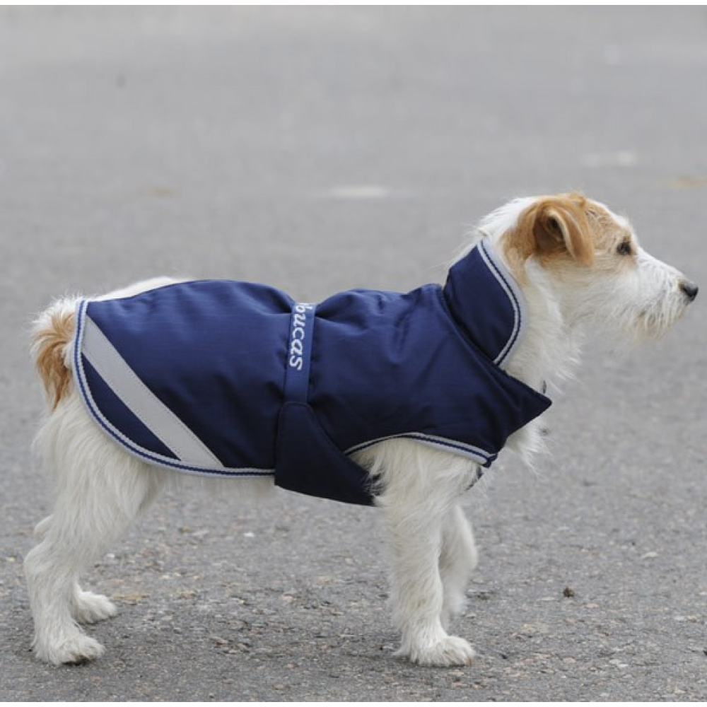 Sterke, waterdichte hondendeken van Bucas. Deze sterke deken is 50 gram polyfill gevoerd en heeft reflectie strepen, om de veiligheid van uw hond te verbeteren. Gemakkelijk te verstellen dankzij de gespen bij de buikflap.