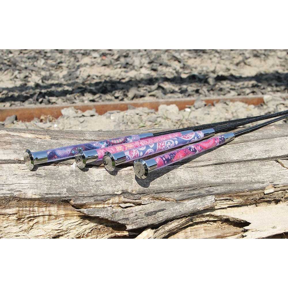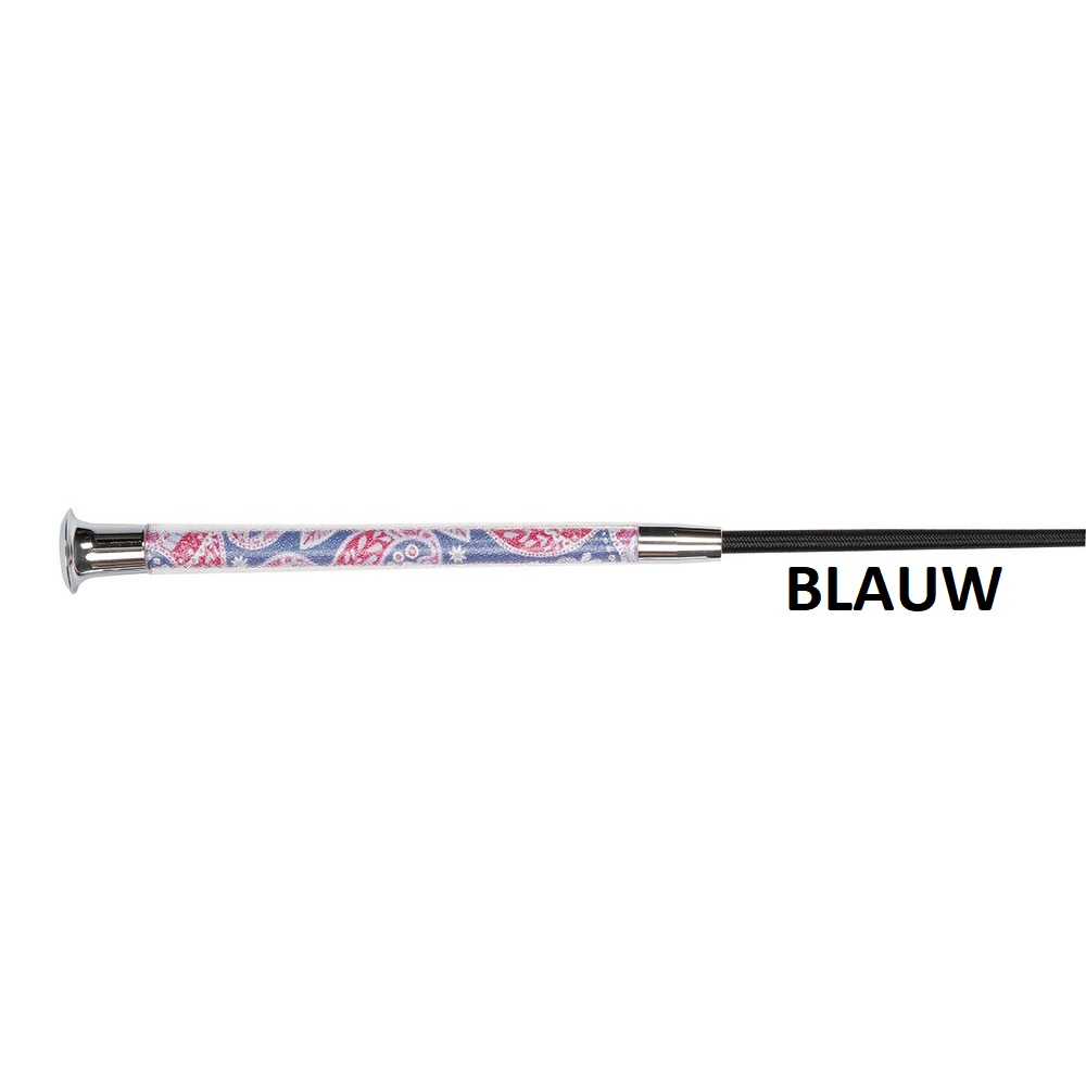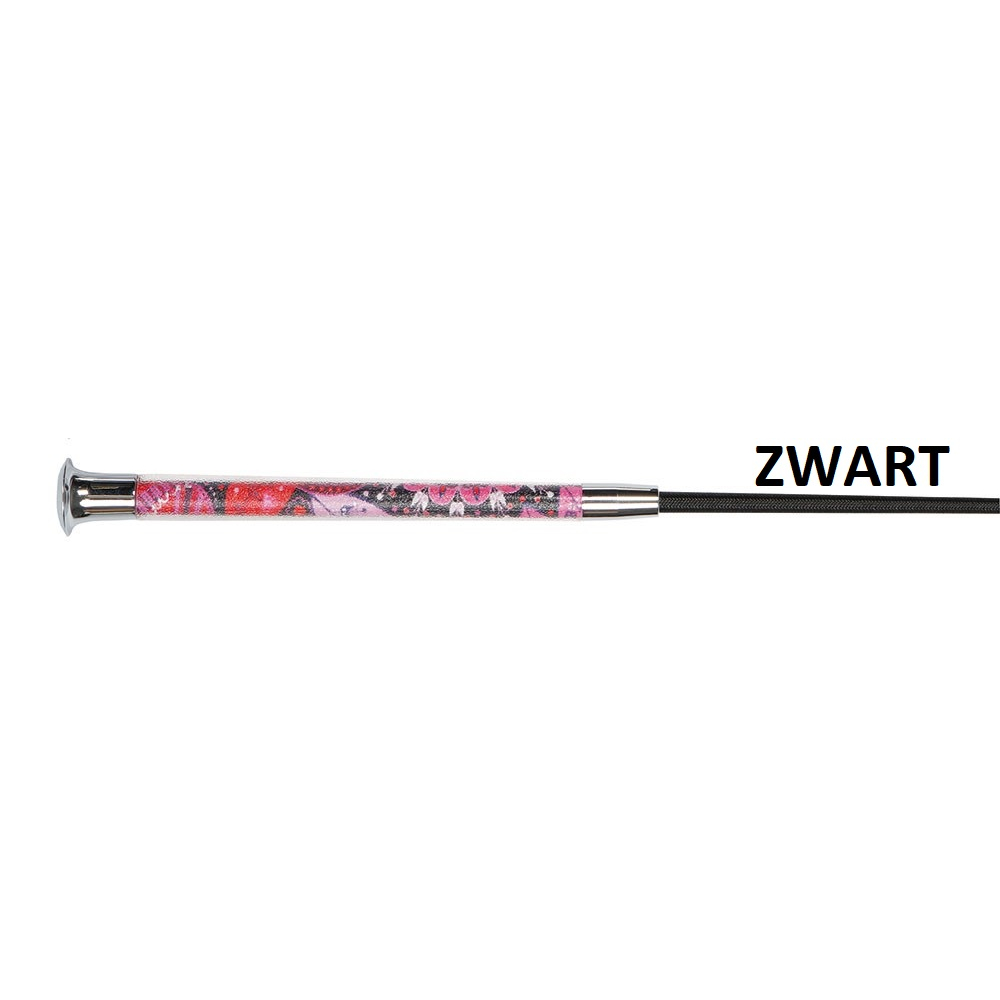 Zweep met effen zwarte steel en een vrolijk gekleurd gel handvat voor extra grip en comfort. Afgewerkt met zilverkleurige dop.