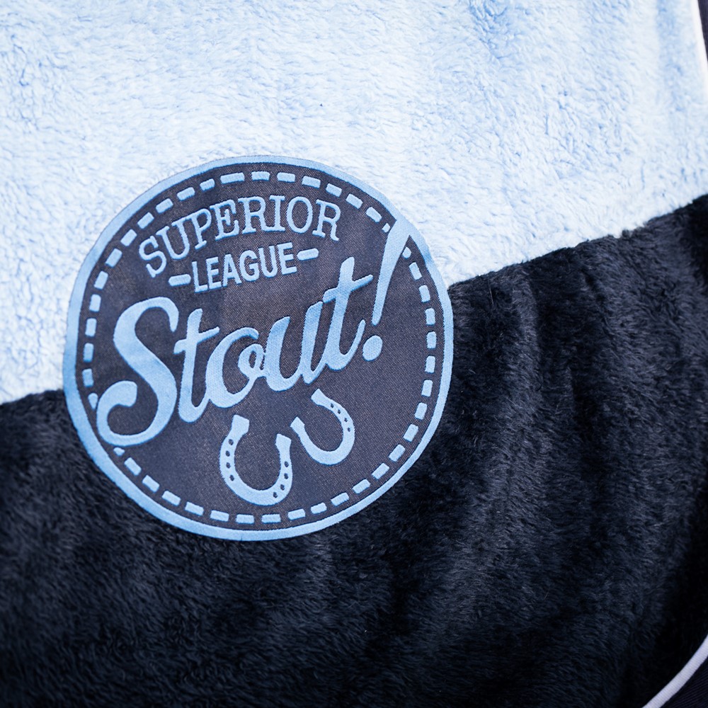 Fleecedeken met kruissingels,staartlus en een groot STOUT! logo op de linkerkant