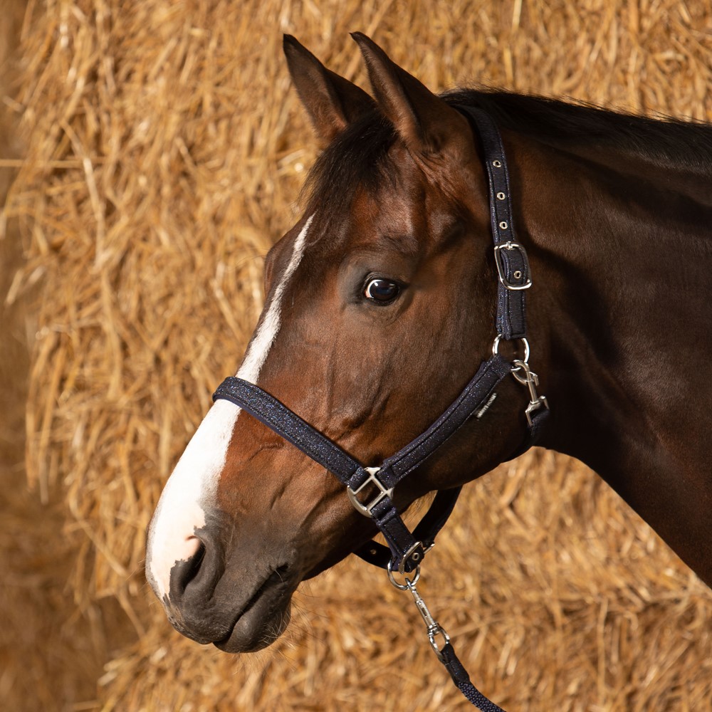 Halsterset met een schitterende glitterglans. Onderlegd met neopreen onder het kopstuk en de neusriem voor extra comfort. Verstelbaar op twee plaatsen; aan het kopstuk en aan de kin. Clipsluiting aan de kaak.