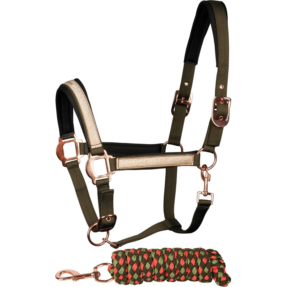 Halsterset met glitter band op de neus- en kaakband en een print op de neusband, neopreen onderlegd op hoofd- neus- en kaakband, verstelbaar bij neus- en kopstuk en metallic buckles.