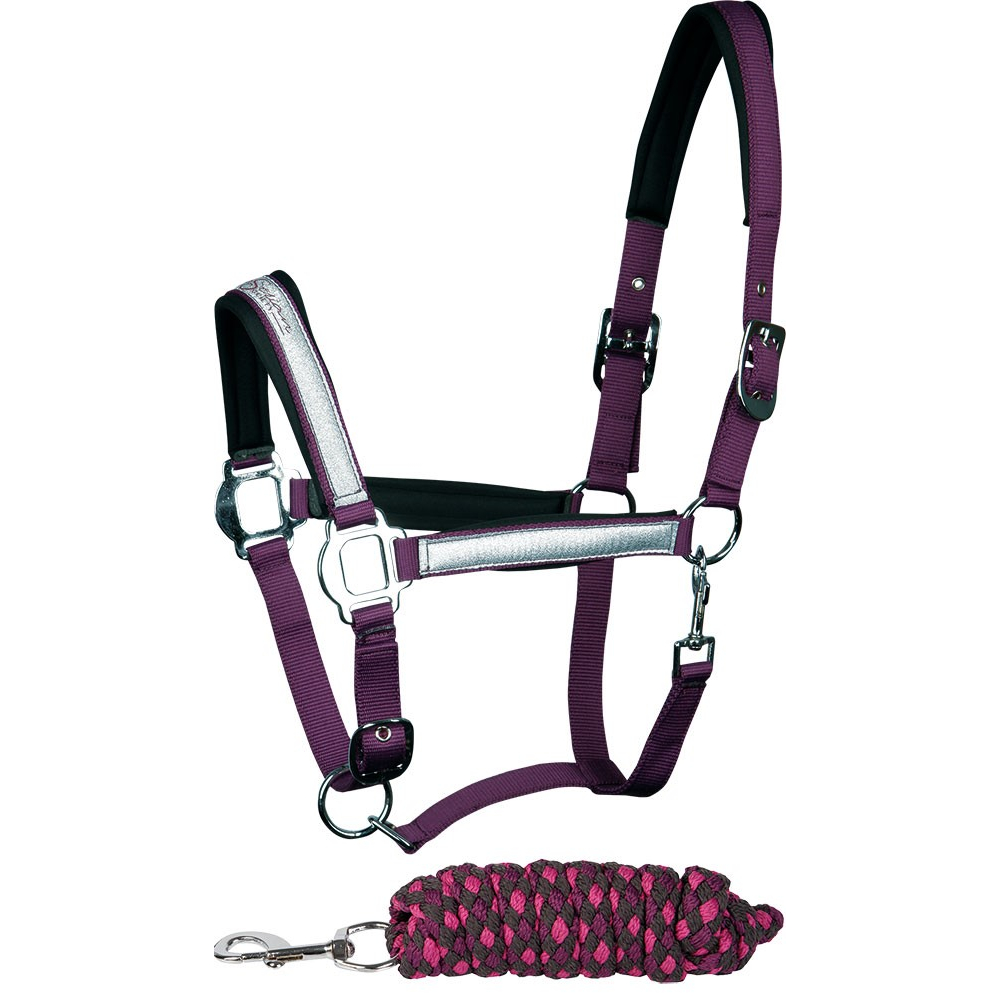 Halsterset met glitter band op de neus- en kaakband en een print op de neusband, neopreen onderlegd op hoofd- neus- en kaakband, verstelbaar bij neus- en kopstuk en metallic buckles.