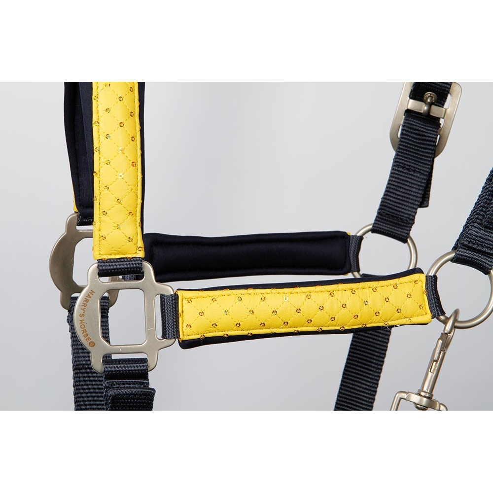 Halsterset met kunstleer en pailletjes op de neus en bakstukken, zachte neopreen padding, dubbel verstelbaar op het kopstuk en tevens verstelbaar onder de kin, inclusief bijpassend touw.