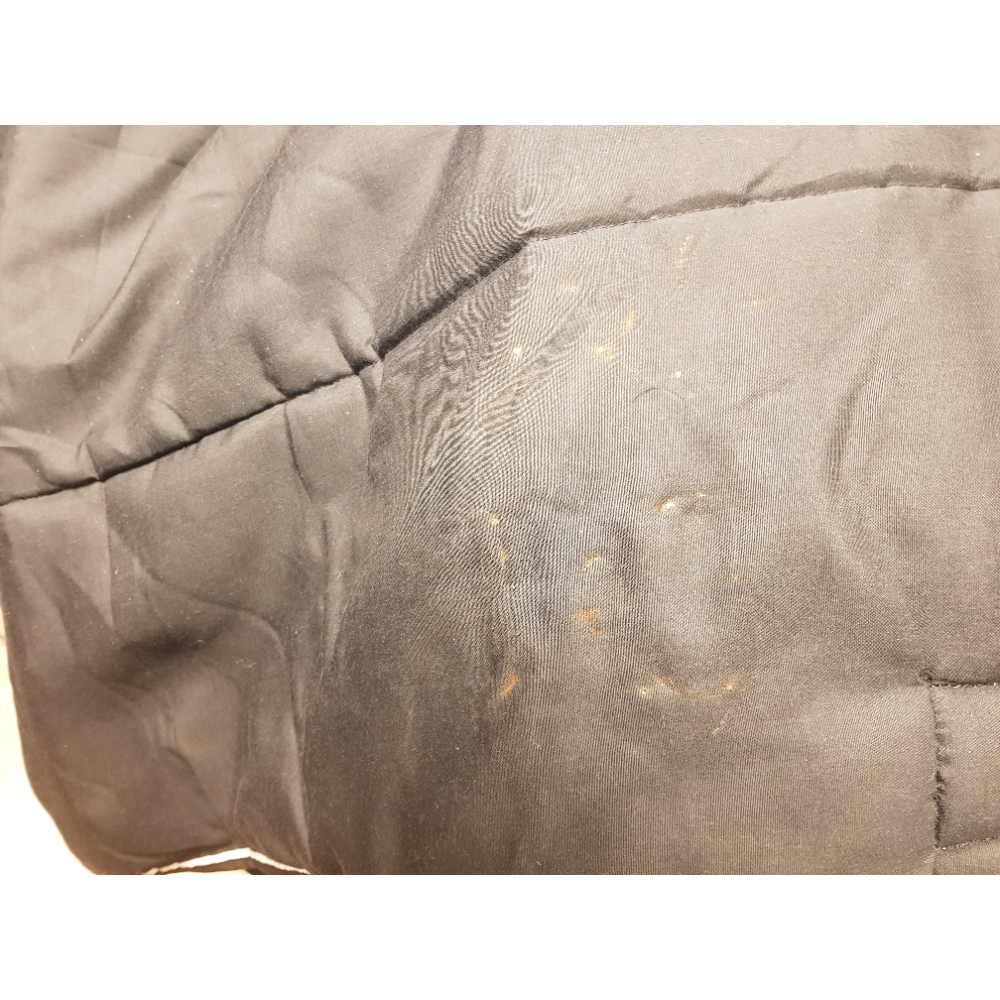 Op de laatste foto is de schade ingezoomd in beeld gebracht. Het beslaat een stuk van ongeveer 25 x 25 cm. Wij hebben de deken niet gewassen, wellicht dat dit nog kan helpen.