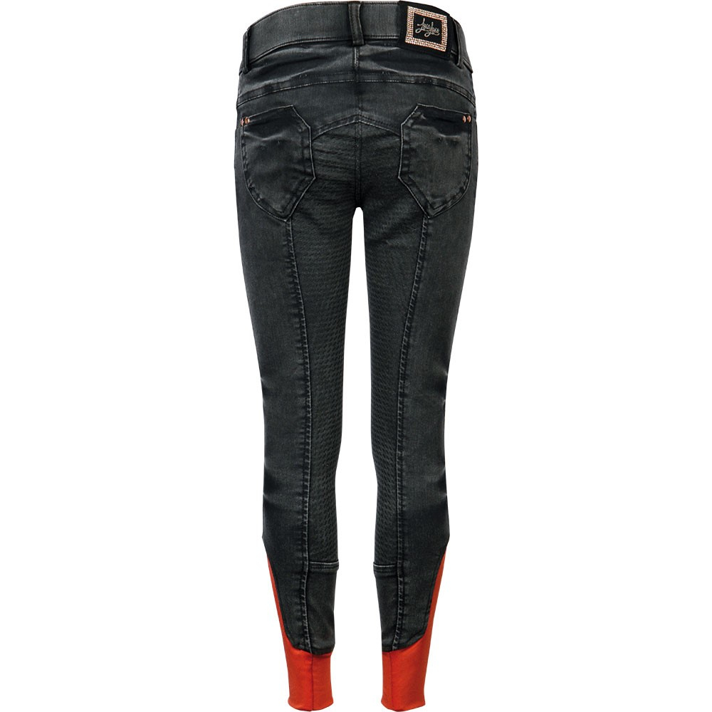 Denim rijbroek met twee steekzakken, twee kontzakken, diverse rosegold studs, luxe badge op de achterkant met crystallen en een LouLou print, crystallen op de coinpocket, rondgenaaid zitvlak voorzien van een siliconen print voor extra grip in het zadel,flexlegs