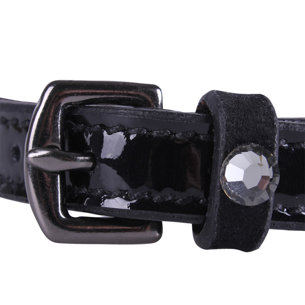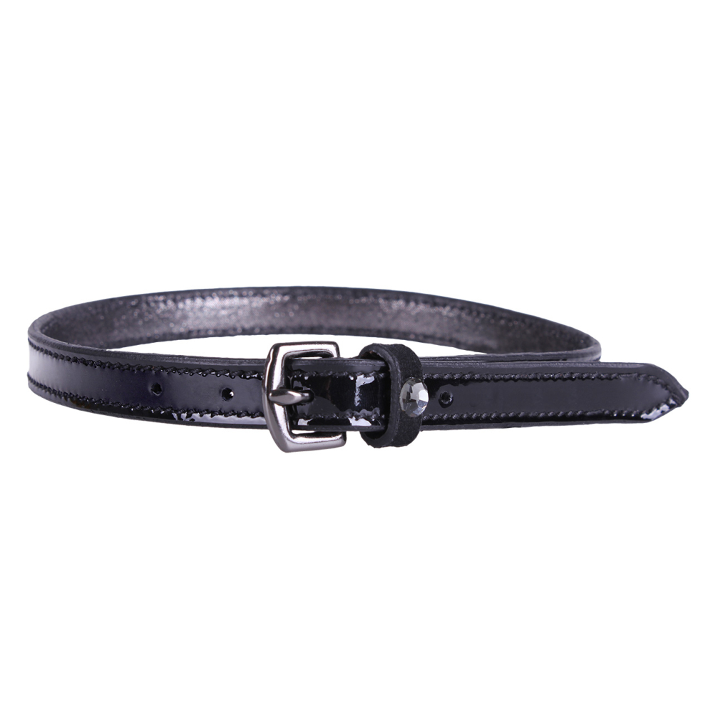 Zwarte lakleren sporenriempjes met zilverkleurige RVS-gesp. Afgewerkt met suedine passant met grijze strass steen.